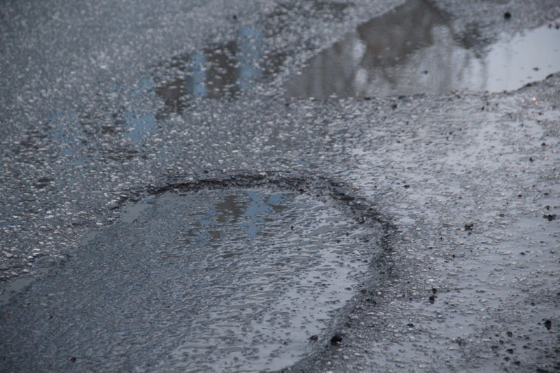 Обнаруженный провал не единственное разрушение на этом отрезке Степана Разина. В некоторых местах на дорожном покрытии образовались «проплешины» от разрушающегося верхнего слоя. Это создает ощущение, что с приходом весны дорога начала линять, сбрасывая старую «асфальтовую шкуру». В этом, правда, обнаружился и некоторый плюс: на поверхности проступили крышки смотровых колодцев, которые были закатаны под асфальт в процессе его укладки, и теперь в случае необходимости их не придется искать при помощи металлодетектора или нащупывать буром. На этом фоне разрушающийся шов сопряжения полос, тянущийся змейкой по середине проезжей части, кажется абсолютно гармоничным явлением.