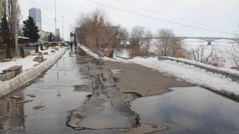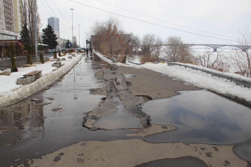 На верхнем ярусе Набережной Космонавтов, недалеко от памятника Юрию Гагарину с приходом весны начала разрушаться пешеходная зона.
