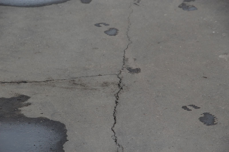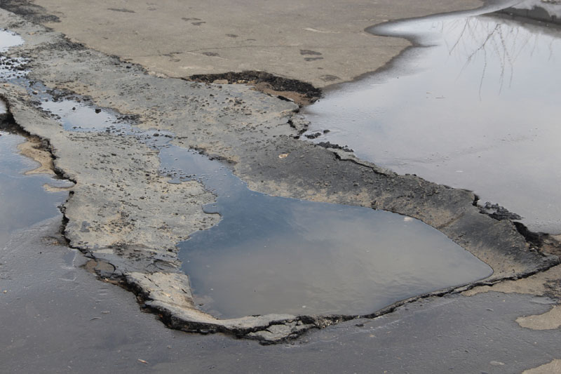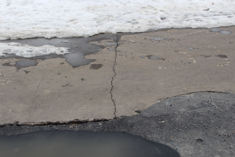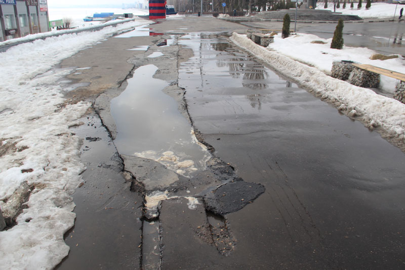 Посередине тротуара провалилась латка из литого асфальта. Талые воды активно заполняют своеобразное «корыто», увеличивая давление на подмываемое основание. В некоторых местах глубина ямы достигает десятков сантиметров, что в скором времени грозит полным разрушением покрытия.