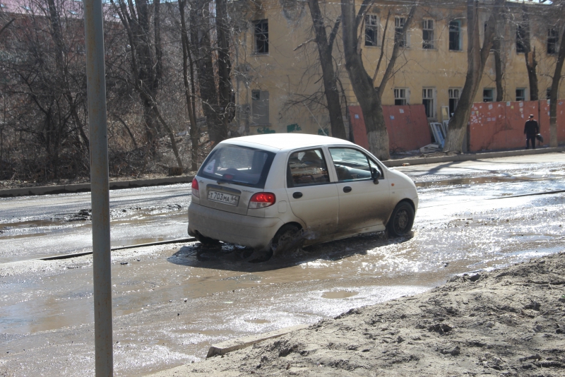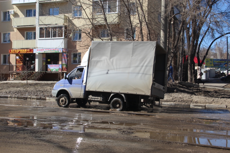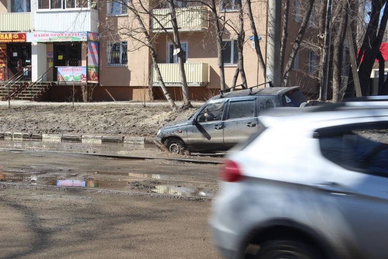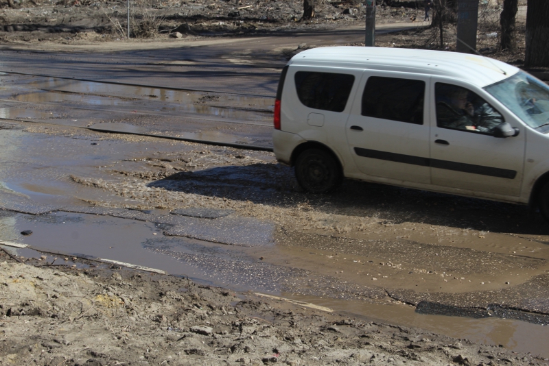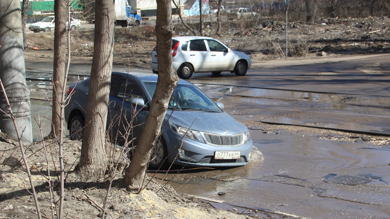 Почти каждую минуту на этом разбитом участке очередной автомобиль попадает в яму, рискуя повредить подвеску или пробить колеса.