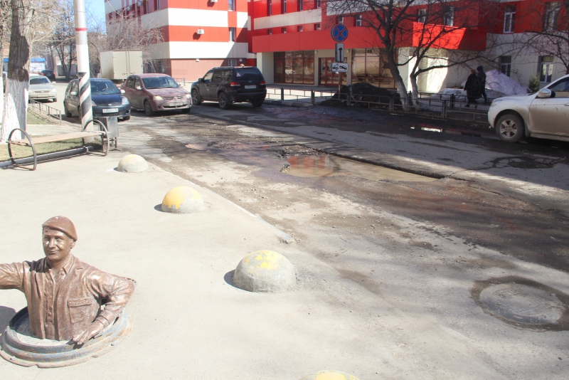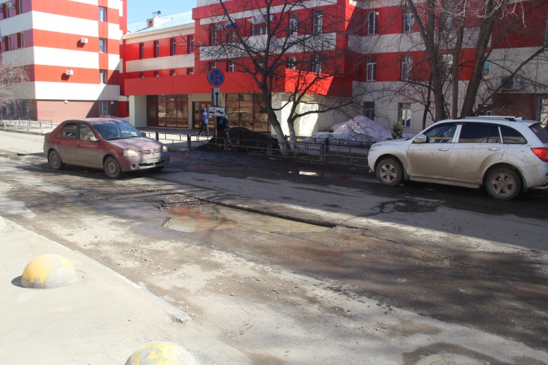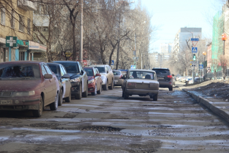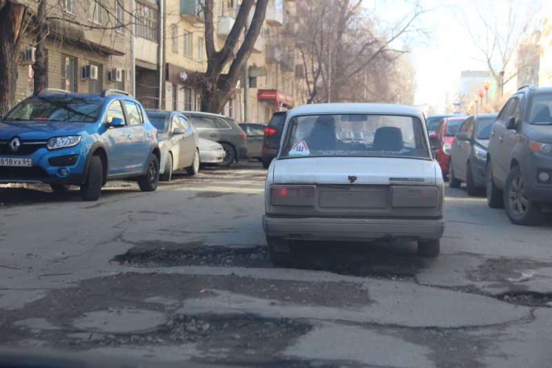 Сама улица Белоглинская до пересечения с Вольской также изобилует выбоинами. Обилие припаркованного транспорта лишает водителей возможности маневра для объезда препятствий. Они вынуждены ехать по ямам, рискуя повредить свои автомобили.
