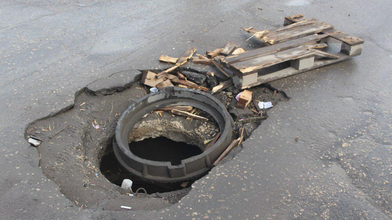 Неожиданное препятствие заставляет водителей объезжать его по встречной полосе, и лишь остатки поддона хоть как-то обозначают открытый колодец.
