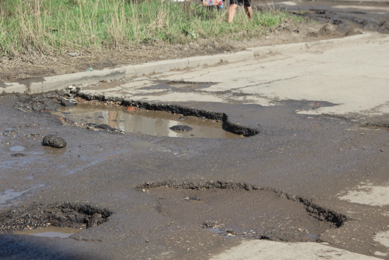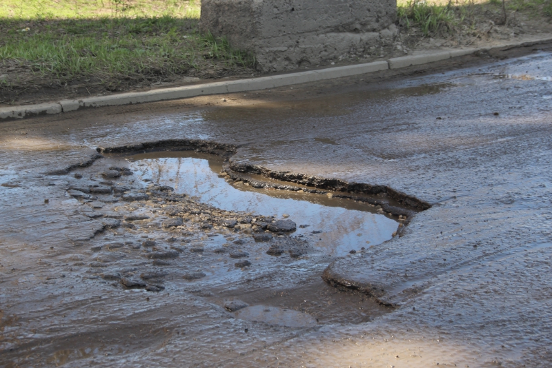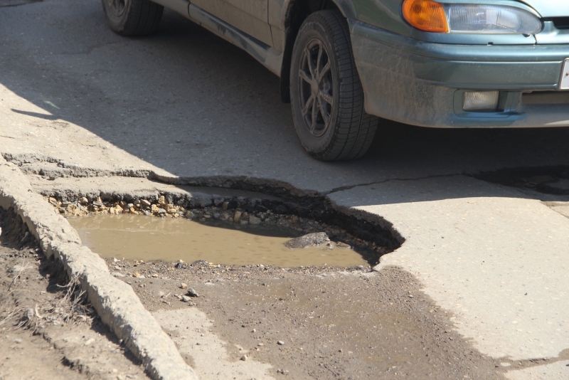 В тех местах, где объехать выбоины не представляется возможным, водители рискуют целостностью транспортного средства и едут по ямам, проваливаясь в них полностью одним колесом.