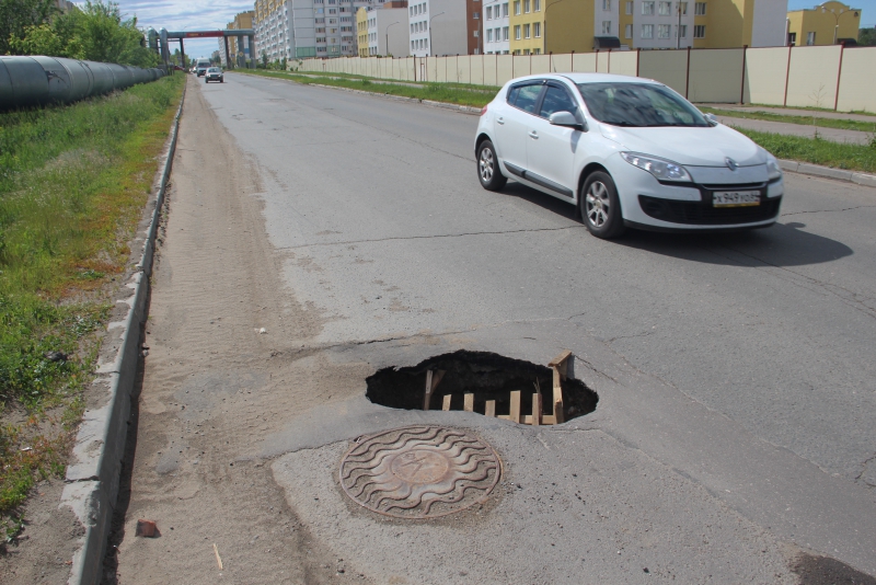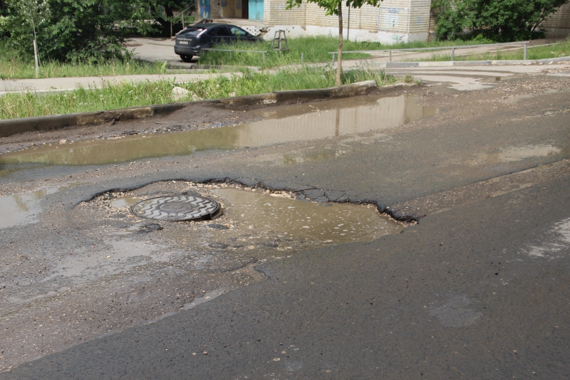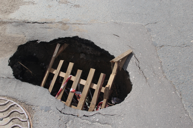 Перед пересечением с улицей Топольчанской асфальт и вовсе провалился. Глубокая дыра образовалась рядом со смотровым колодцем. В нее же и провалился обозначавший опасное препятствие деревянный забочик. В темное время суток яма практически не заметна, и, как уточнили местные жители, пребывает в таком состоянии уже неделю. Судя по просадкам, которые появились у соседних смотровых колодцев, возможно, в скором времени на улице Блинова появятся новые провалы.
