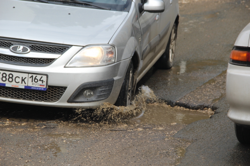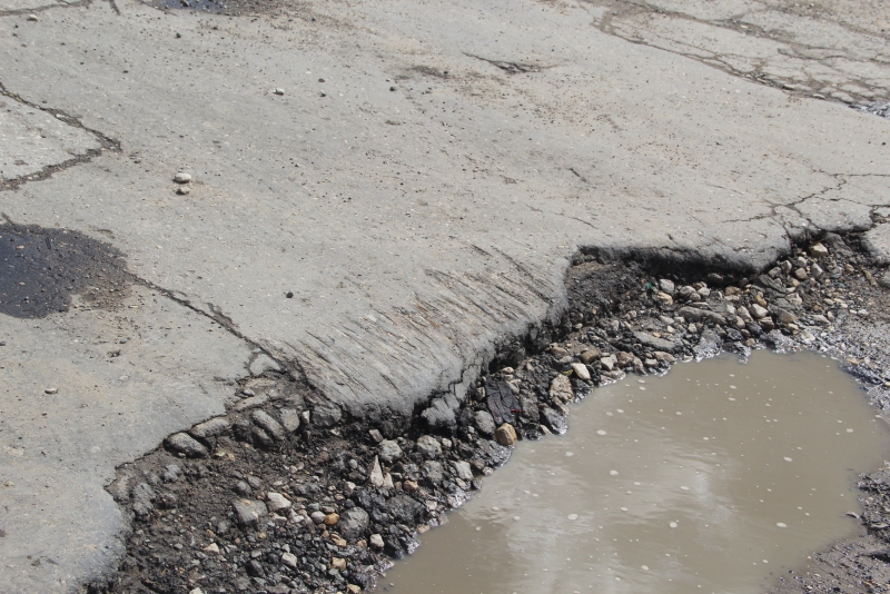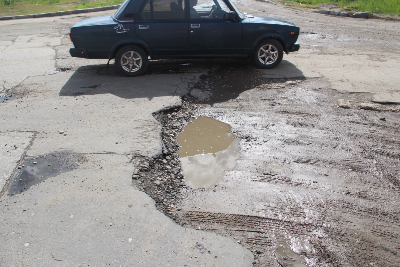 Полностью разрушен перекресток на пересечении улицы Блинова и Перспективной, у гипермакета «Магнит». Создается ощущение, что этот участок дороги, перепахали трактором, и только потом немного укатали. На асфальте по краям выбоин видны следы того, что о них царапались автомобили своими днищами или картерами.