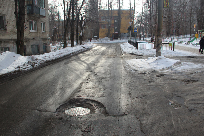 И вот в ходе очередного ямочного ремонта, проводившегося на это дороге, часть смотровых колодцев была приведена в нормативное состояние. Но два люка рядом с пересечением с улицей Новоузенской оказались проигнорированы, либо незамечены, из-за чего невозможно безопасно передвигаться по потенциально эксплуатационной дороге.