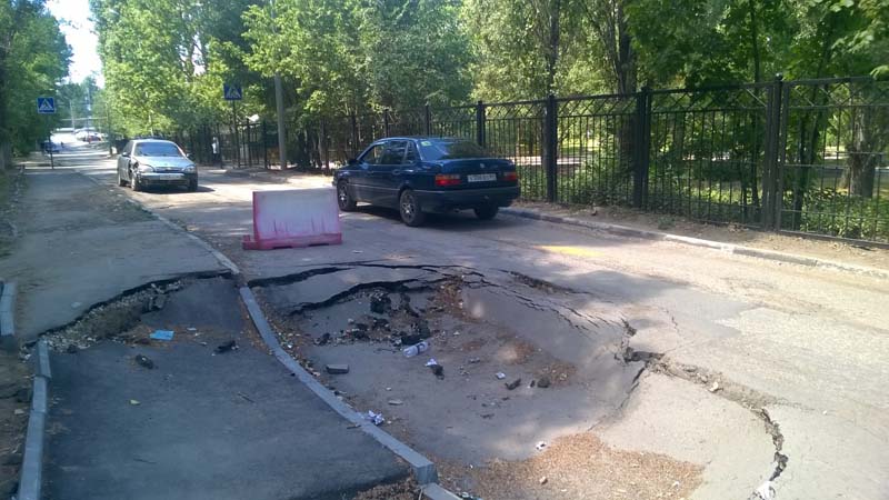 Второй месяц огромный провал на улице Электронной у дома №6 угрожает безопастности как водителей, так и пешеходов. Глубокая яма заняла половину проезжей части, захватив также полностью и тротуар. В образовавшийся котлован вполне может поместиться легковой автомобиль.
