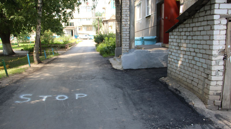 Само новое асфальтобетонное покрытие, уложенное во дворах, визуально вызывает тревогу за его долголетие. Асфальт везде неоднороден, наблюдается вышелушивание покрытия, а продавливающийся под ногами асфальт у входных групп и вдоль цоколя домов встречается повсеместно. На таком покрытии уже начали образовываться выбоины, обнажая старое основание, а щебень вылетает из асфальта от прикосновения ноги.