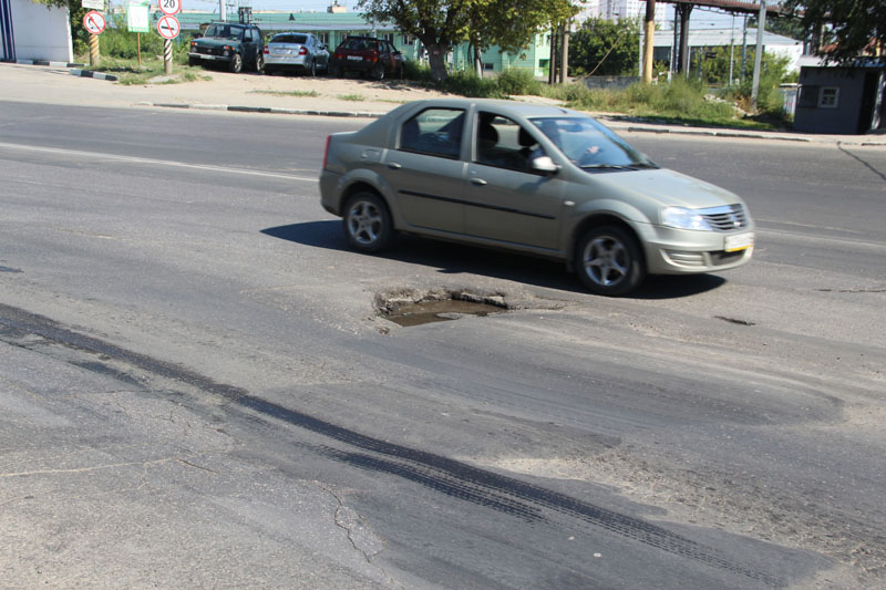 На крутом повороте, где оживленная улица Политехническая переходит в Ново-Астраханское шоссе, движению транспортных средств мешает глубокая выбоина.