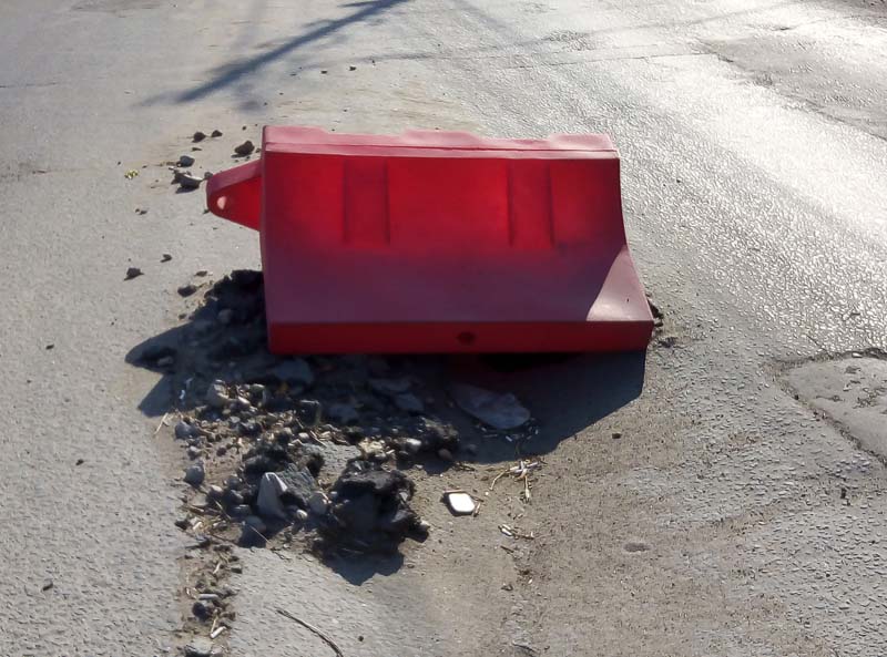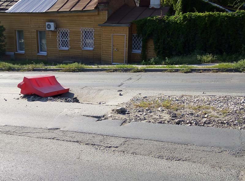 Лишь водоналивной блок, хоть как-то обозначает опасный участок, одновременно прикрывая глубокую яму, провалившись в которую автомобиль уже не сможет продолжить путь самостоятельно.