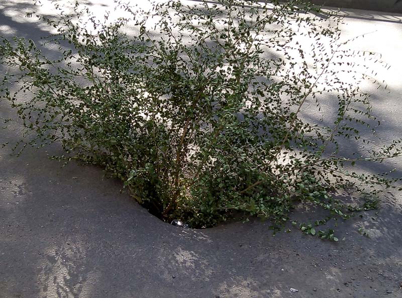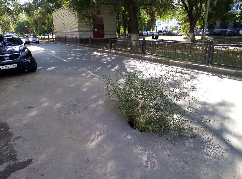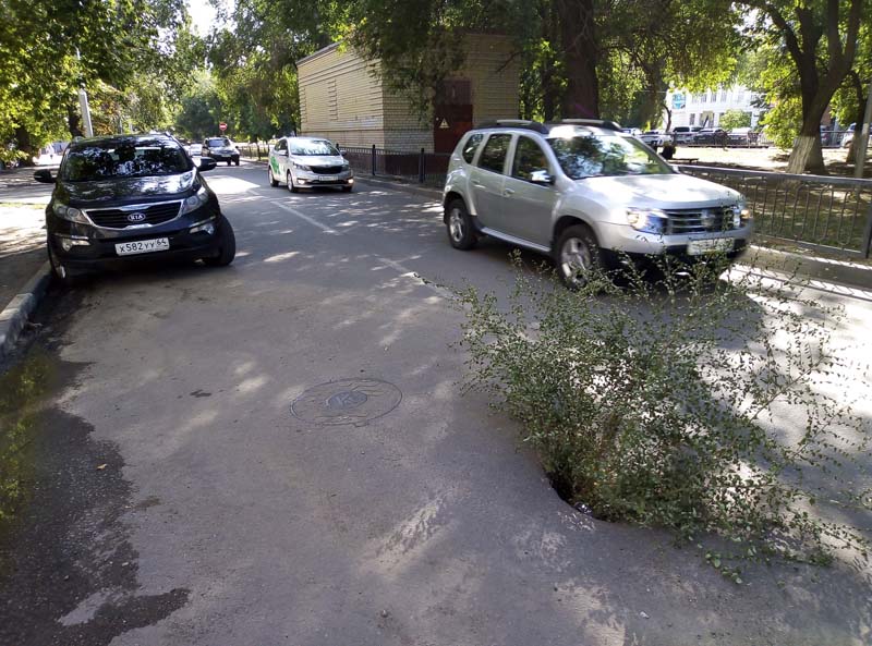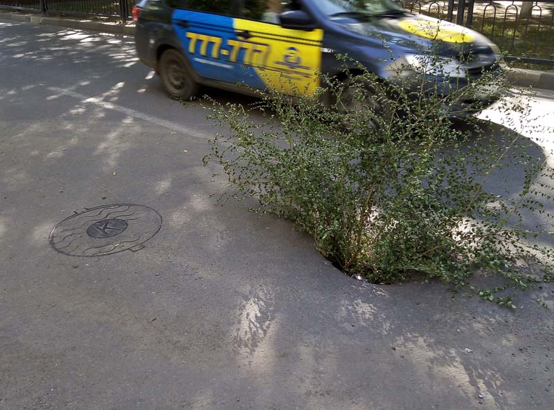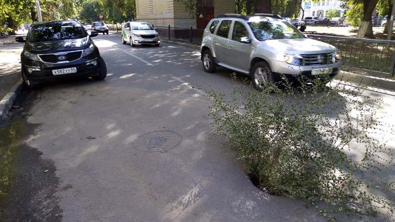 Обилие припаркованного транспорта на этой оживленной дороге оставляет для проезда водителей всего лишь одну полосу. В глубокую яму местные жители воткнули раскидистую ветку, чтобы хоть как-то обозначить препятствие.