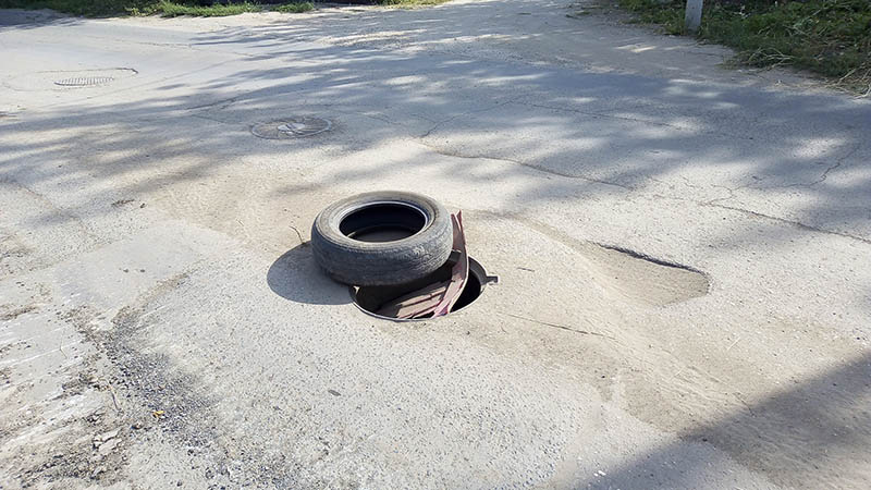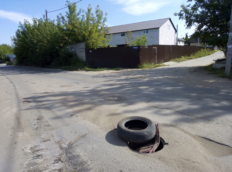 В первые «Дорожный контроль» написал о нем в начале апреля, тогда препятствие было обозначено сосной, оставшейся с новогодних праздников. Потом ее сменил водоналивной блок . Теперь же открытый колодец обозначен старой покрышкой. Когда же на нем появится предусмотренная конструкцией крышка, остается только гадать.