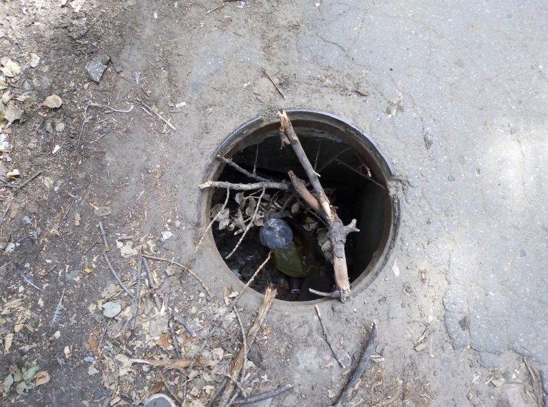 Ветки, которыми пытались обозначить открытый люк, провалились в колодец, и препятствие почти незаметно для автолюбителей. Смотровой колодец находиться на неосвещенном участке дороги, из-за чего в вечернее время представляет серьезную угрозу для безопасности пешеходов, использующих проезжую часть для передвижения из-за отсутствующих тротуаров.
