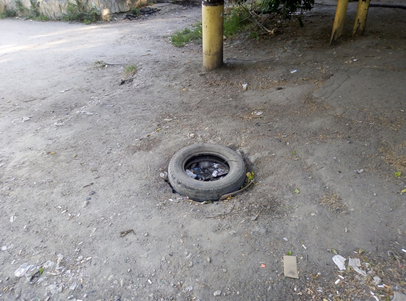 Общее ощущение разрухи и неустроенности дополняют смотровые колодцы, закрытые старыми покрышками, дверьми или вовсе закиданные мусором. При этом крышка одного из люков лежит рядом.