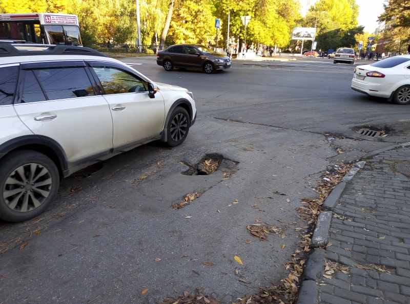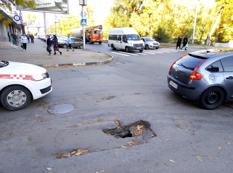 Об этой яме «Дорожный контроль» сообщал три месяца назад, но с тех пор ситуация не изменилась в лучшую сторону. Края провала продолжают расширяться, делая яму только опаснее. Находящееся в центральной части города, рядом с остановками общественного транспорта и торговыми центрами, препятствие никак не обозначили, и оно поджидает невнимательных водителей и пешеходов.