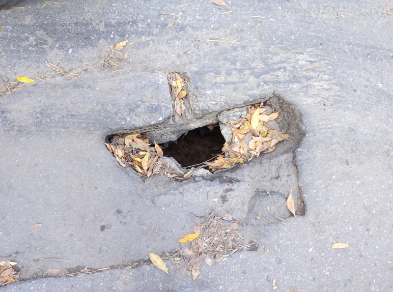 В глубокую яму может полностью поместиться колесо легкового автомобиля, после чего его придется уже вытаскивать. Пешеходы, особенно дети, рискуют и вовсе угодить ногой в провал, глубина которого и "начинка" остается неизвестной.