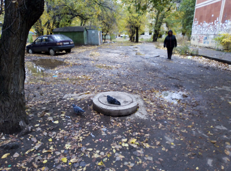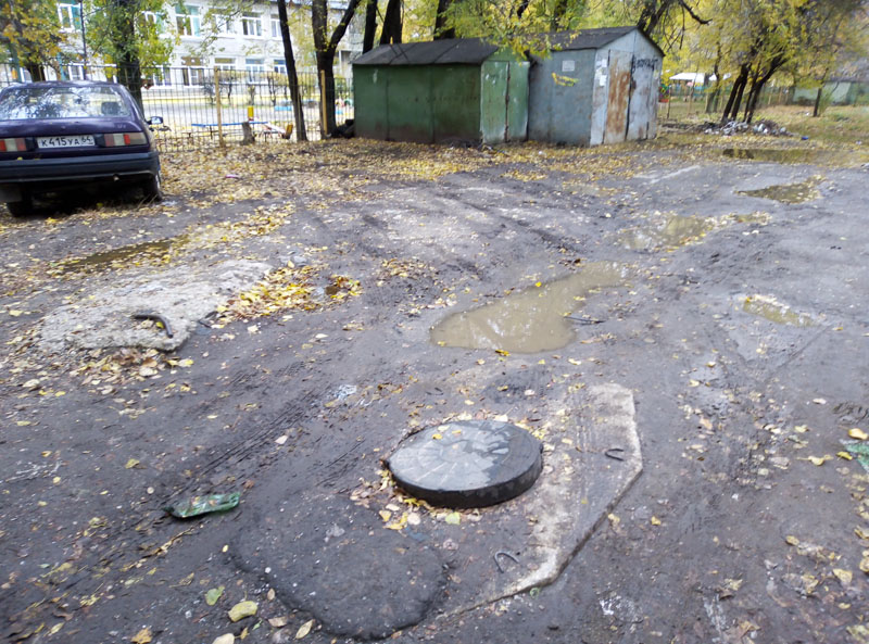 Рядом находится еще один люк, прикрытый сверху неподходящей по размеру крышкой. Насколько данная конструкция устойчива, можно только предположить. В темное время суток заметить препятствие становится и вовсе проблематично.