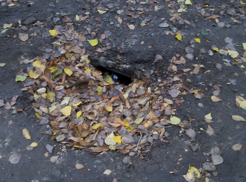 Заметить открытый смотровой колодец действительно очень трудно, как будто его специально засыпали листвой. Находится он рядом со входом в образовательное учреждение на зеленой зоне, которую многие использует для обхода луж, образовавшихся на проезжей части. Заигравшийся ребенок вполне может угодить в незаметную яму.