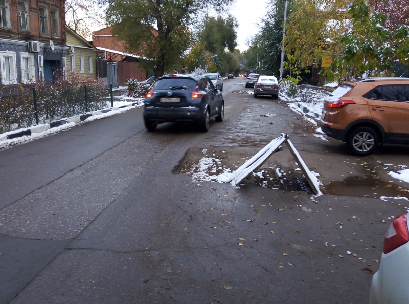 На участке между улицами Чапаева и Вольской четыре необозначеных ямы расположились друг за другом по нечетной стороне улицы Гоголя, и перекрывают одну из полос для движения.