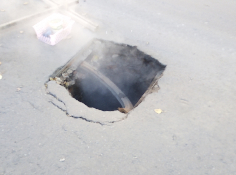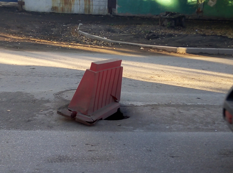 Яма находится по центру проезжей части, рядом со смотровым колодцем
