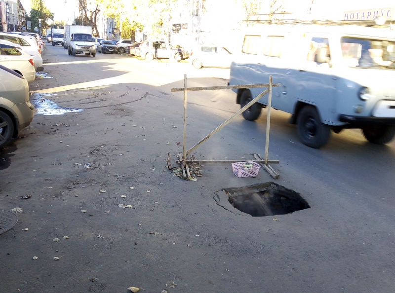В середине сентября «Дорожный контроль» сообщал о провале на улице Степана Разина, напротив дома 65.