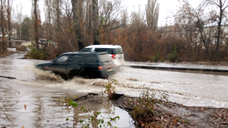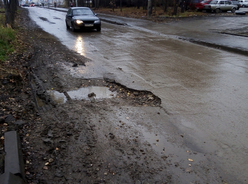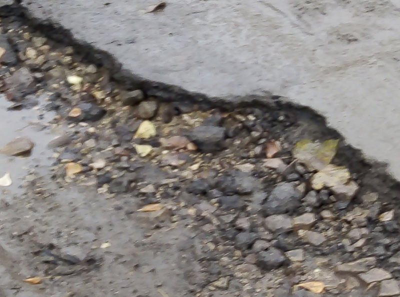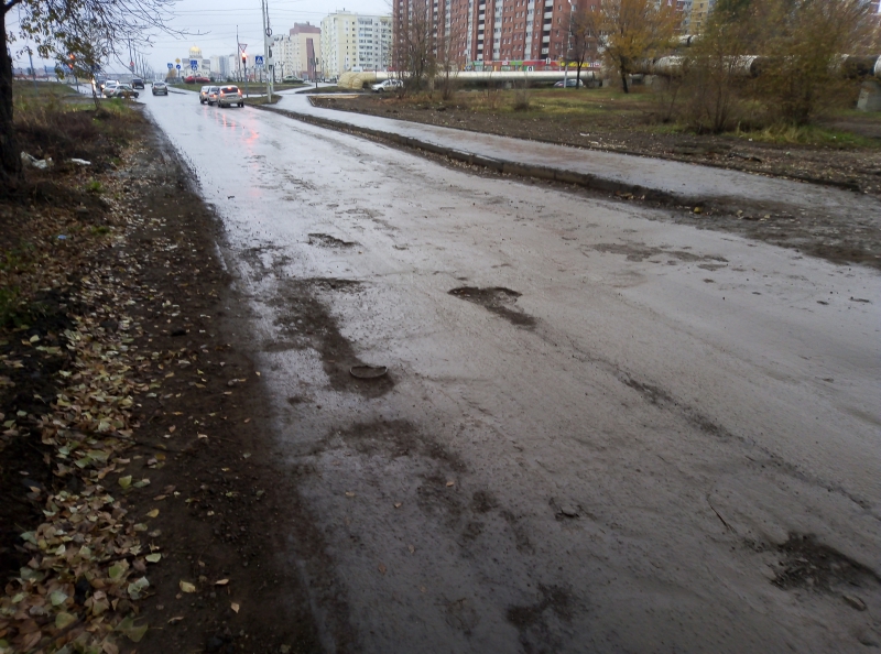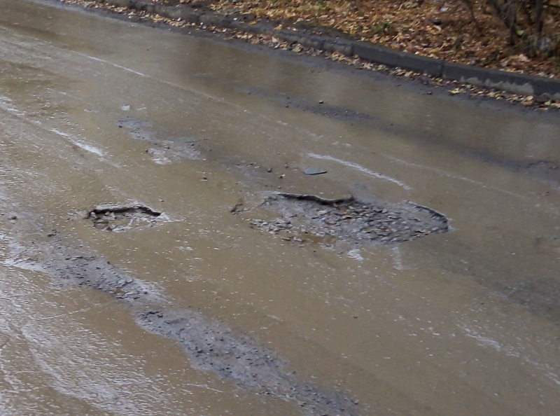 Кроме остатков столба движению по улице Мамонтовой мешает ряд глубоких выбоин, некоторые из которых разбиты до щебеночного основания дороги.
