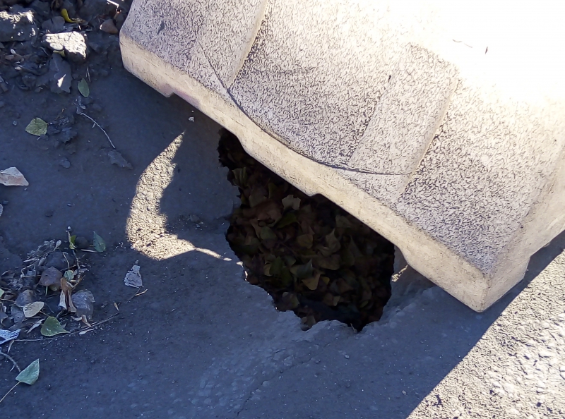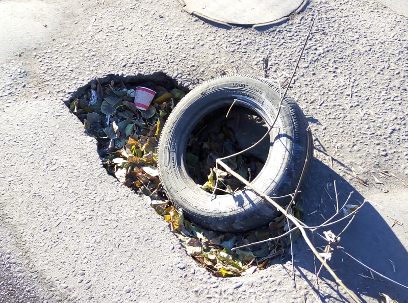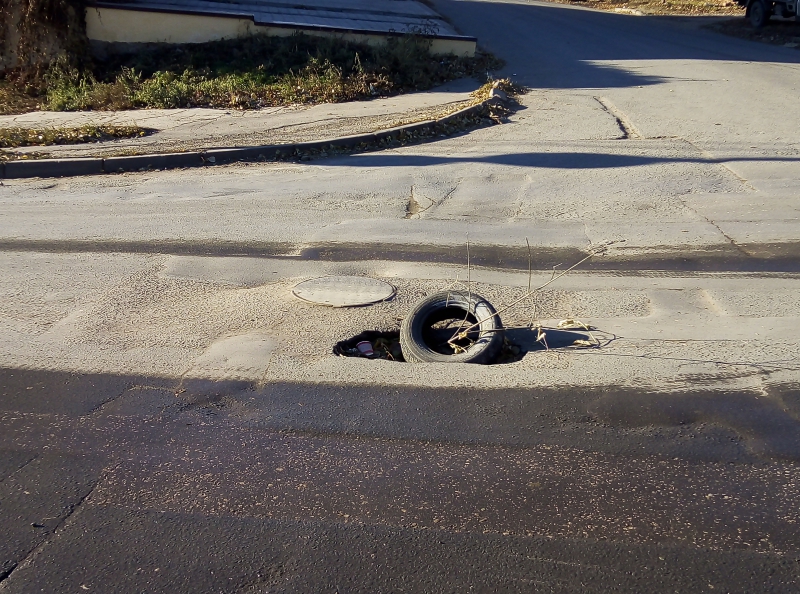 Чтобы обозначить препятствие, местные жители положили в яму старую покрышку. Это не единственный провал на улице Вознесенской. На полсотню метров ниже, в сторону Глебучева оврага, находится еще один провал, обозначенный водоналивным блоком, ставший за год своего существования местной достопримечательностью. Между двумя этими ямами расположилась глубокая просадка, также значительно затрудняющая движение транспортных средств.
