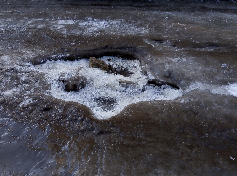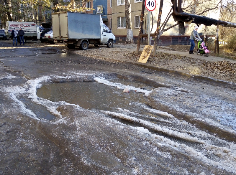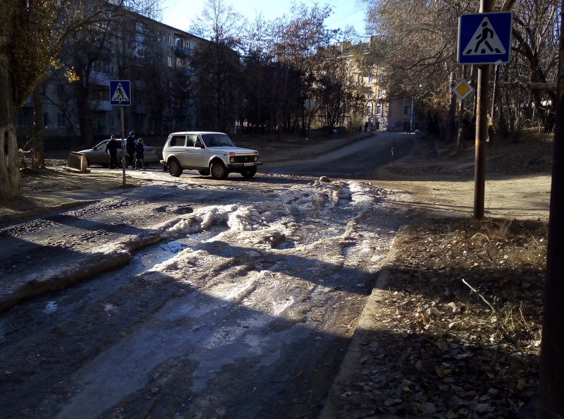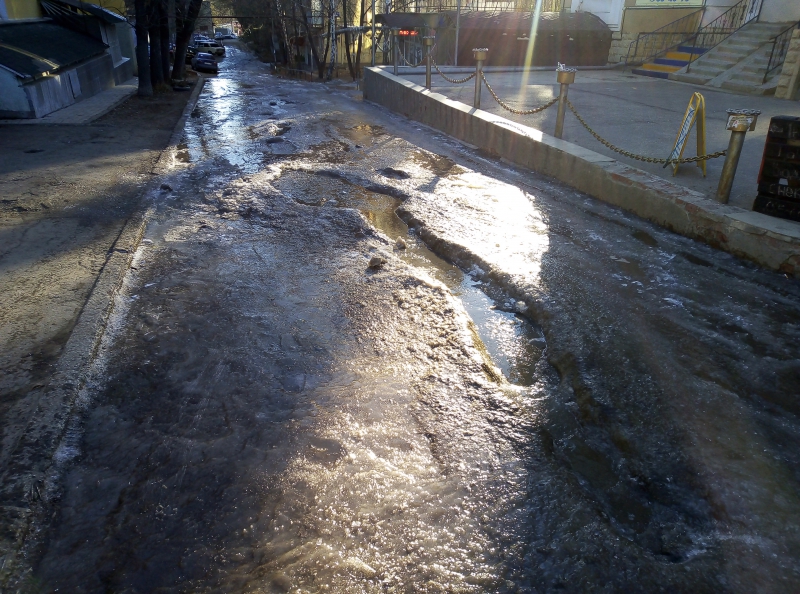С похожей жалобой обратилась в редакцию Ирина, сообщившая о том, что улица Осенняя превратилась в ледяное поле и невозможно подъехать к школе №75. Причиной обледенения стала также коммунальная авария, которую на данный момент устраняют. Также оперативно расчистили проезд по улице Осенней. Но при этом всего в нескольких десятках метрах от места проведения аварийных работ толстым слоем наледи покрыт перекресток улиц Студеной и Аптечной. Судя по глубоким лужам, излив воды в этом месте продолжается, но никаких работ по устранению аварии и восстановлению безопасного проезда не ведется.