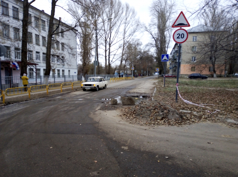 Рядом с пешеходным переходом, ведущим к образовательному учреждению, на дороге находится разрытый коммунальщиками котлован. Когда-то он был обозначен воткнутыми ветками с натянутой лентой, теперь же единственным ограждением заполненной водой ямы служат положенные камни. Прежнее ограждение обвалилось в раскоп, о глубине которого можно только догадываться.