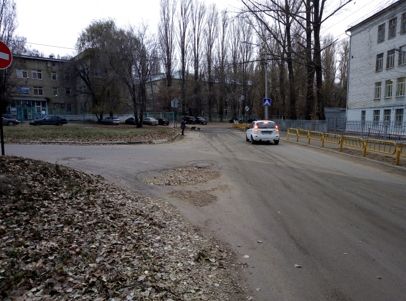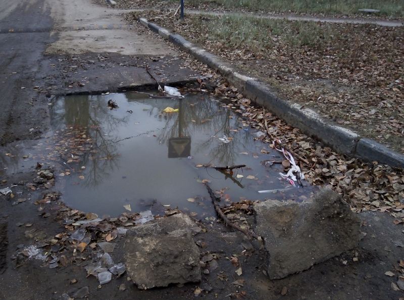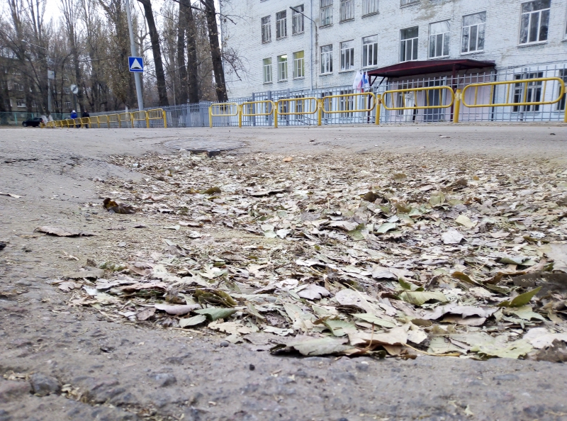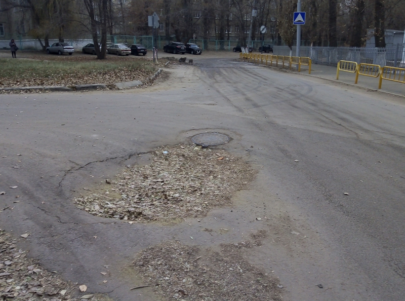 В десятке метрах от него находится еще одна яма, образовавшаяся на месте проседания асфальта рядом со смотровым колодцем. Просадка засыпана листвой, что создает для водителей иллюзию безопасного проезда. При этом яма достаточна глубока, чтобы при попадании в нее автомобиль мог получить значительные повреждения. К тому же, по краям просадки по асфальту пошли трещины, позволяя предположить, что разрушения продолжаются, и в любой момент может образоваться провал.