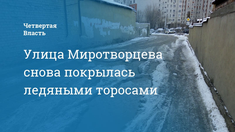 К обледенению покрытия привел ручей, текущий от пересечения улицы Миротворцева с проездом Клочкова. О проблемах с водоотведением в районе Политеха «Дорожный контроль» сообщал неоднократно, от обледенения страдала не только улица Миротворцева, но и соседние дороги, в том числе магистральная дорога по улице Политехнической. МУП «Водосток» вел наблюдения 19 лет и неоднократно пытался решить проблему с водоотведением, но сделать это до конца так и не удалось.
