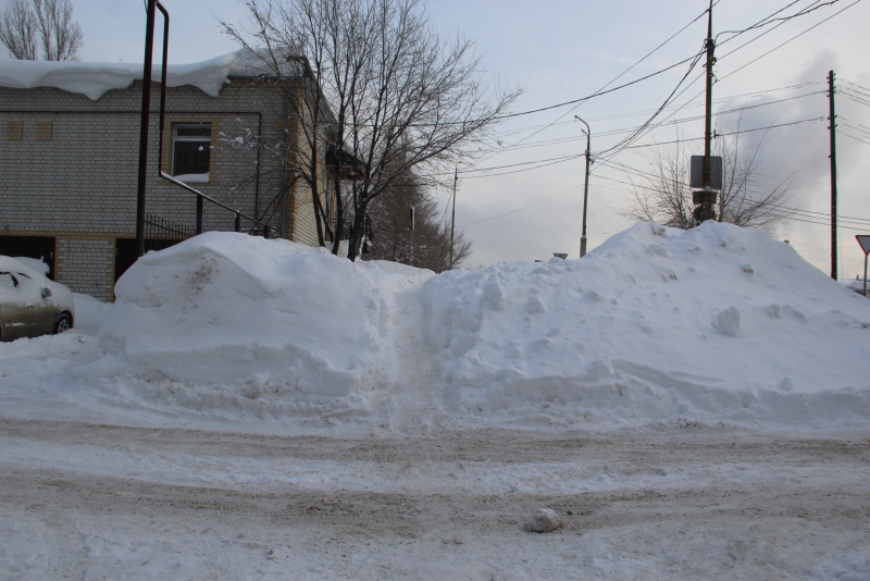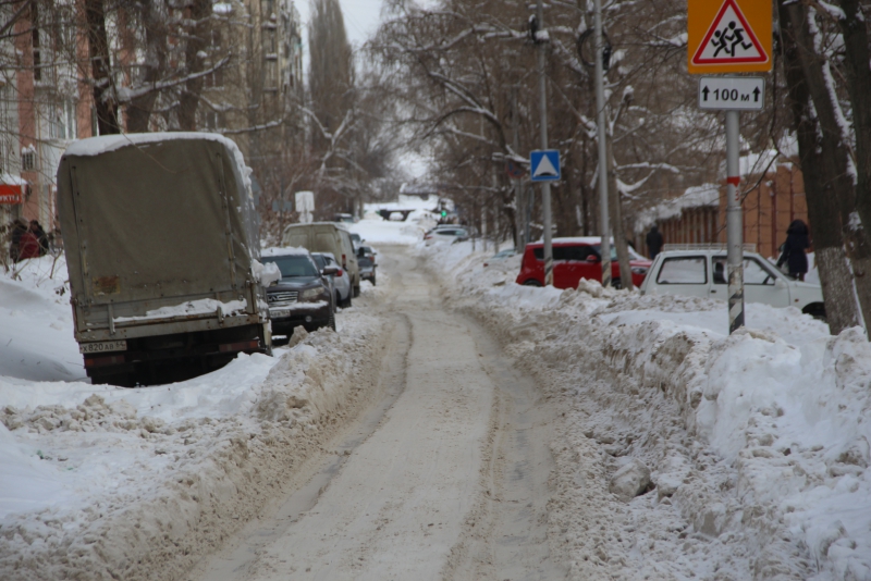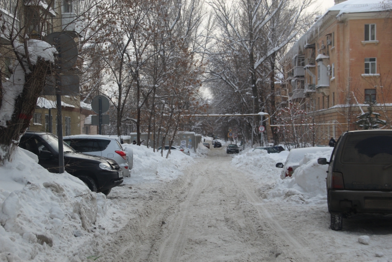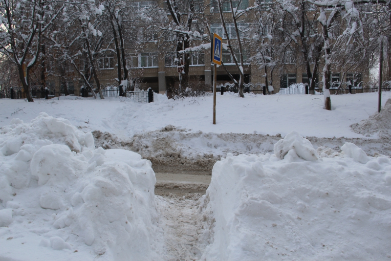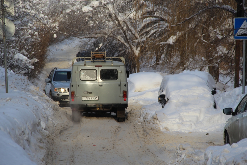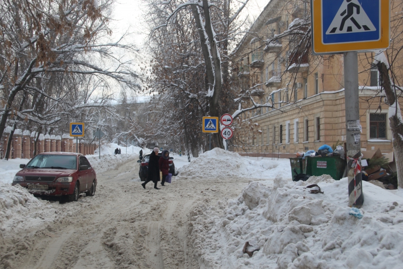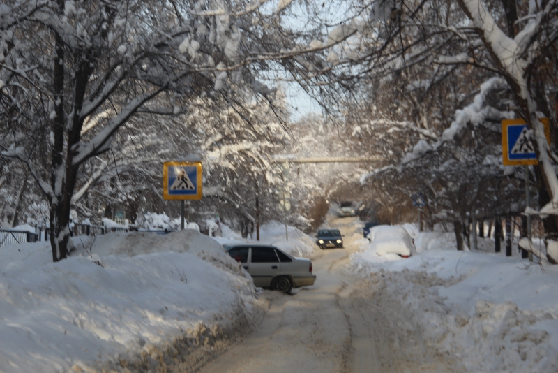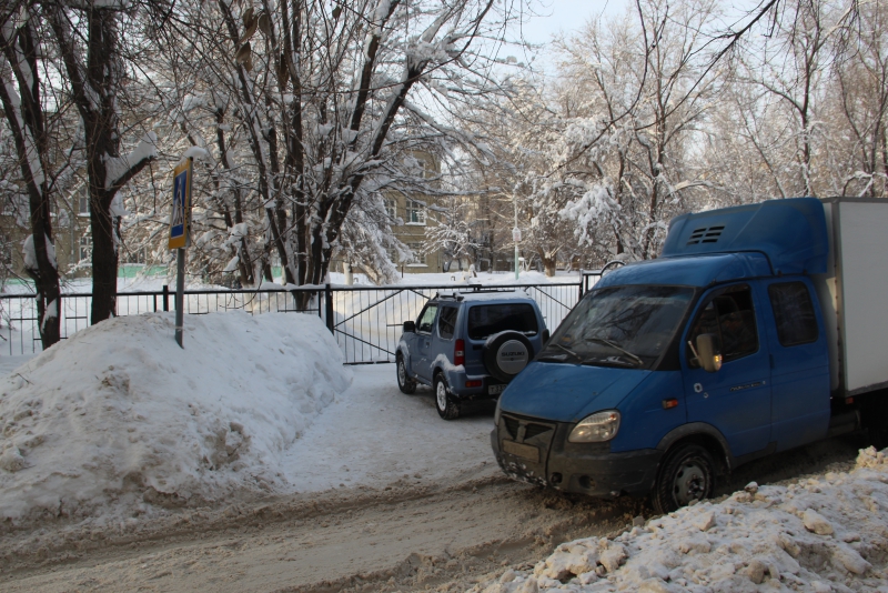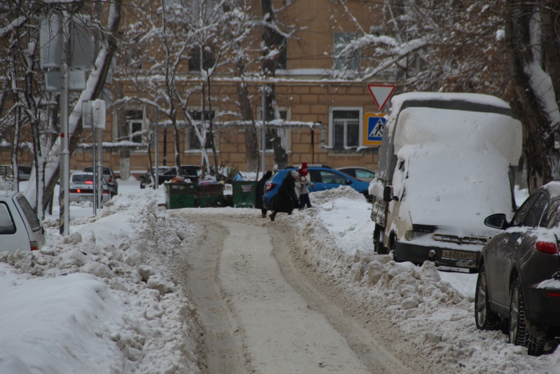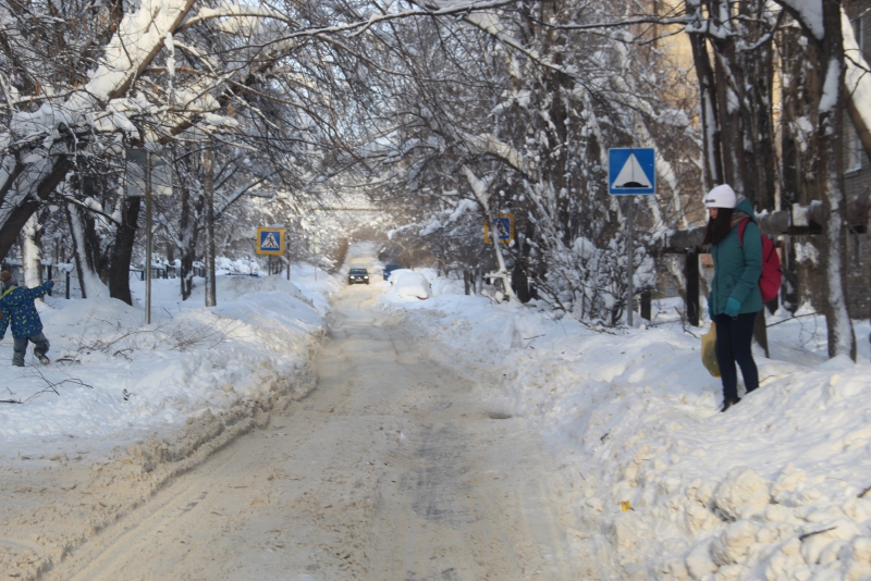 Дорога по 3-му Студеному проезду, на котором находится школа №102 и детский сад №114, превратилась в узкую колею, на которой двум машинам просто негде разъехаться. Часто водителям приходиться сдавать назад половину квартала, чтобы пропустить встречный поток. И в любой момент из-за сугробов может появиться ребенок, заметить которого можно не успеть. При этом машины, угодившие в снежно-ледяную колею на идущей под уклон дороге, просто не смогут вовремя остановиться, не то что отвернуть.