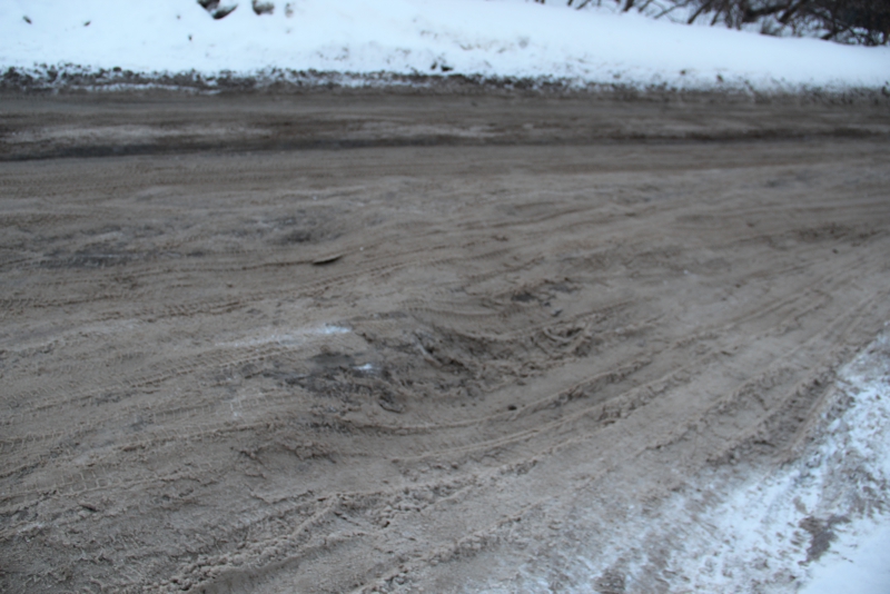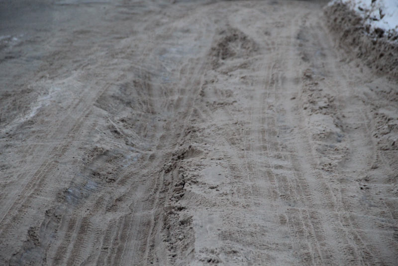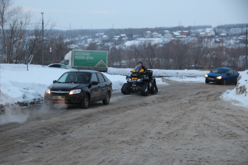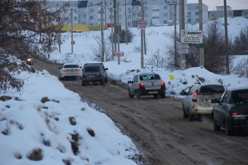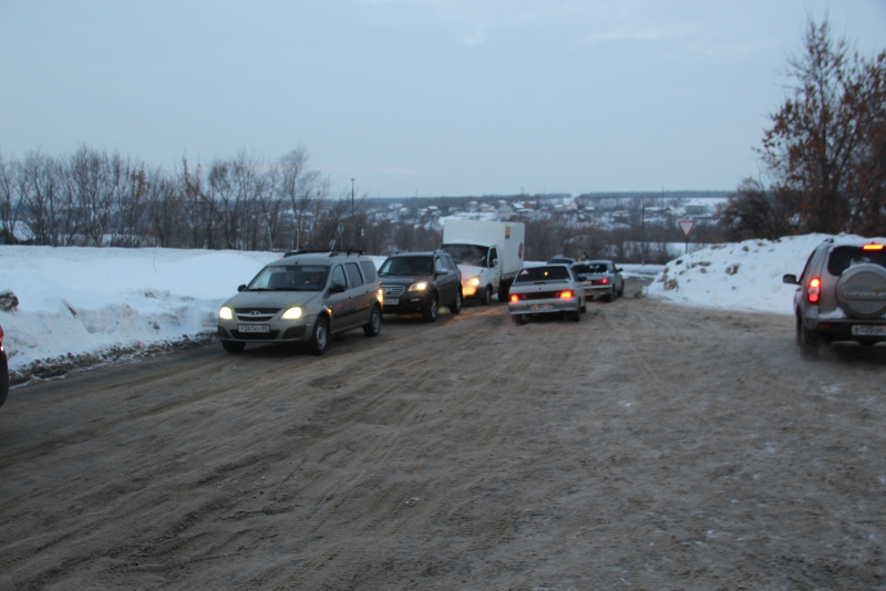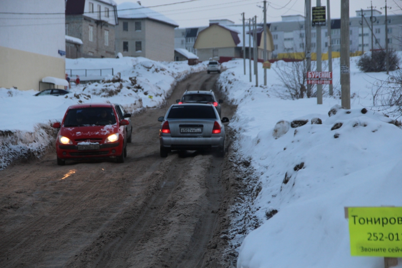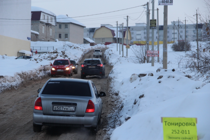 Сугробы и снежные отвалы по краям дороги настолько заузили проезжую часть, что любое остановившееся транспортное средство приводит к образованию затора. Не меньше проблем вызывает и появление на дороге более или менее широкой машины: для того чтобы разъехаться с «Волгой», автолюбителям пришлось использовать прилегающие улицы. Можно предположить, что завернувший на эту дорогу грузовик и вовсе остановит движение, так как объехать его будет негде.