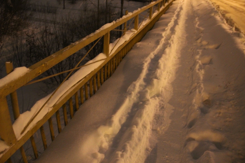Свой воскресный вояж мы начали с того моста, о котором писали в минувшую пятницу. Тем более, нам рассказали, что уже на следующий день после публикации на мосту видели работников с лопатами. Поэтому ехали мы туда констатировать факт, что теперь пешеходам ничего не угрожает. Однако наши ожидания не оправдались. И дело тут не в том, что мост не почистили, а в том , как это сделали. По пешеходной зоне была пробита узкая тропинка, а место для нее выбрали таким образом, что аккурат на ней оказались расположены фонарные столбы, полностью преградившие путь. Видимо, пешеходную дорожку там прокладывали для бестелесных существ, потому что, по нашим наблюдениям, сквозь столбы люди ходить пока не научились. Неудивительно, что для передвижения горожане выбирают натоптанную по неубранному снегу и более опасную тропку вдоль перил, предпочитая риск постоянным прыжкам по сугробам вокруг столбов.