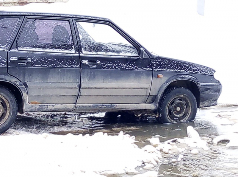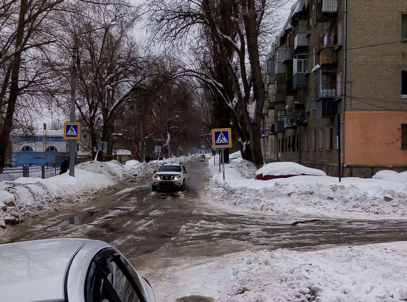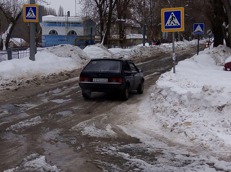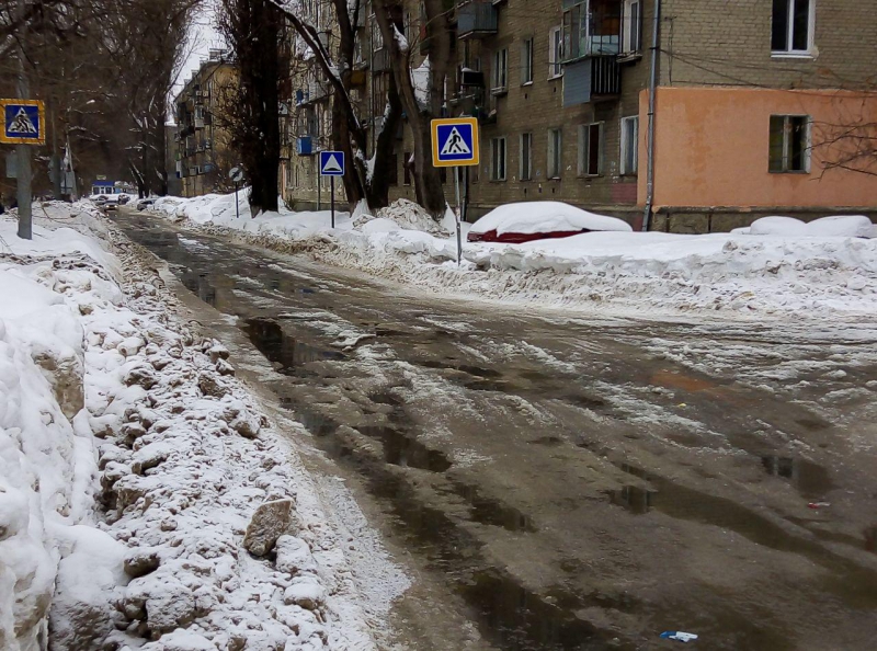 Пешеходы вынуждены перепрыгивать «ароматные» лужи на обледеневшем пешеходном переходе.