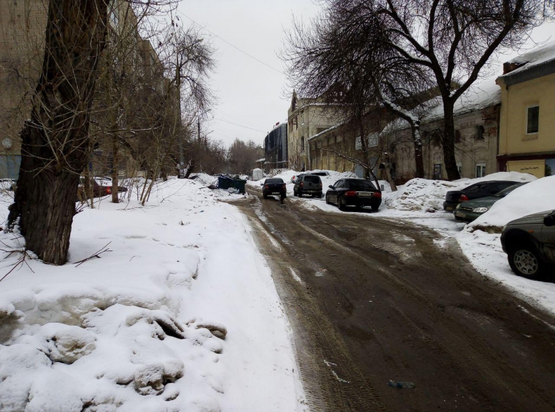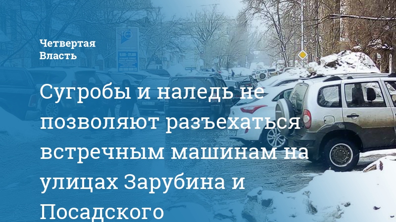 Сугробы и наледь не позволяют разъехаться встречным машинам на улицах Зарубина и Посадского