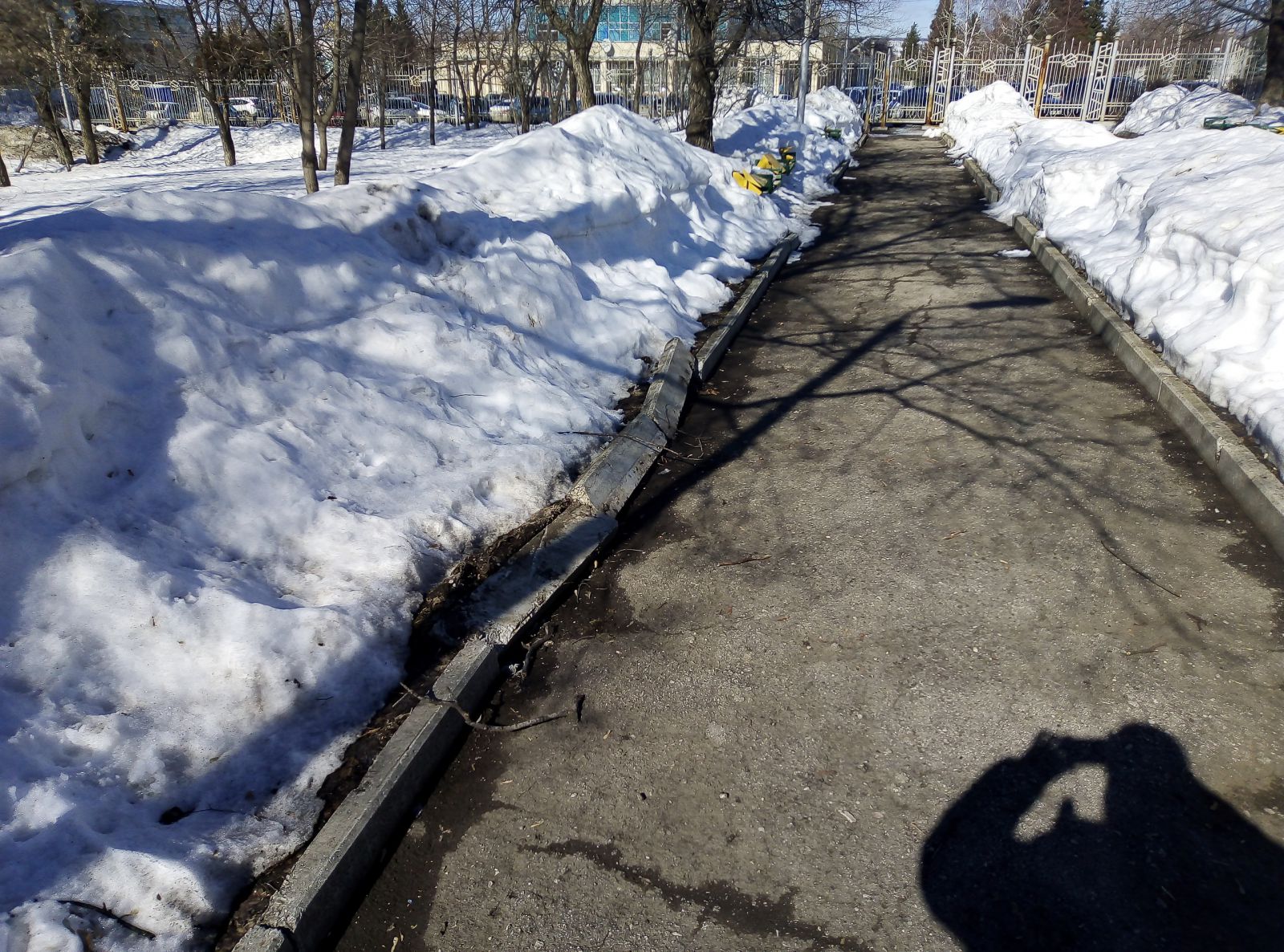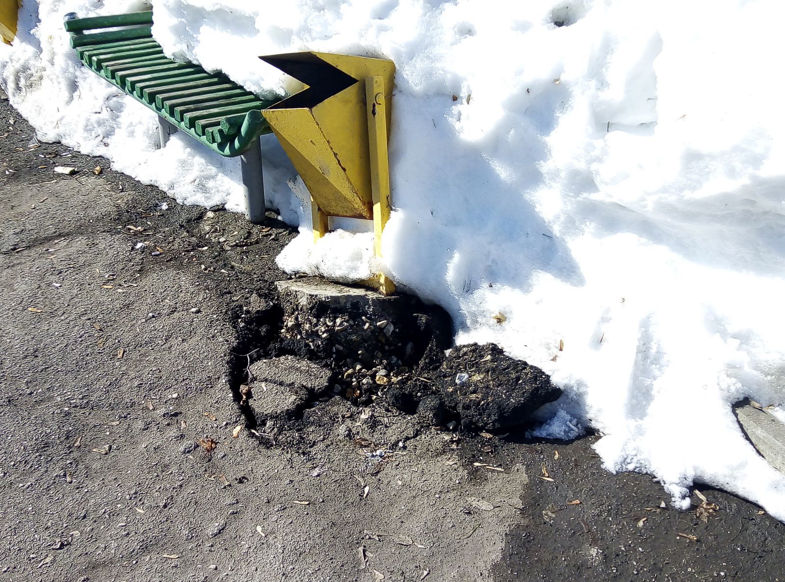 Еще более варварским способом проводилась уборка территории парка у храма «Всех святых в земле Российской просиявших» на проспекте Энтузиастов. Видимо, в процессе работ уборщики сильно спешили, в результате оказались вывороченными с бетонным основанием несколько урн и бортовых камней. При этом половина лавочек в этом сквере так и осталась погребена под сугробами. Но зато на самой пешеходной зоне асфальт.