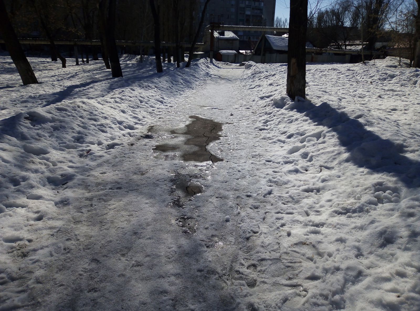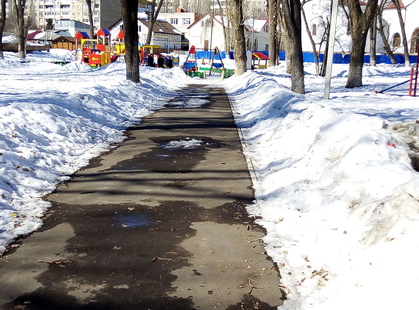 В некоторых скверах дорожки от снега очищались со странной выборочностью. Где-то полностью, до асфальта, на других - оставляя наледь, как в скверах им. Калинина, им. Ленина.