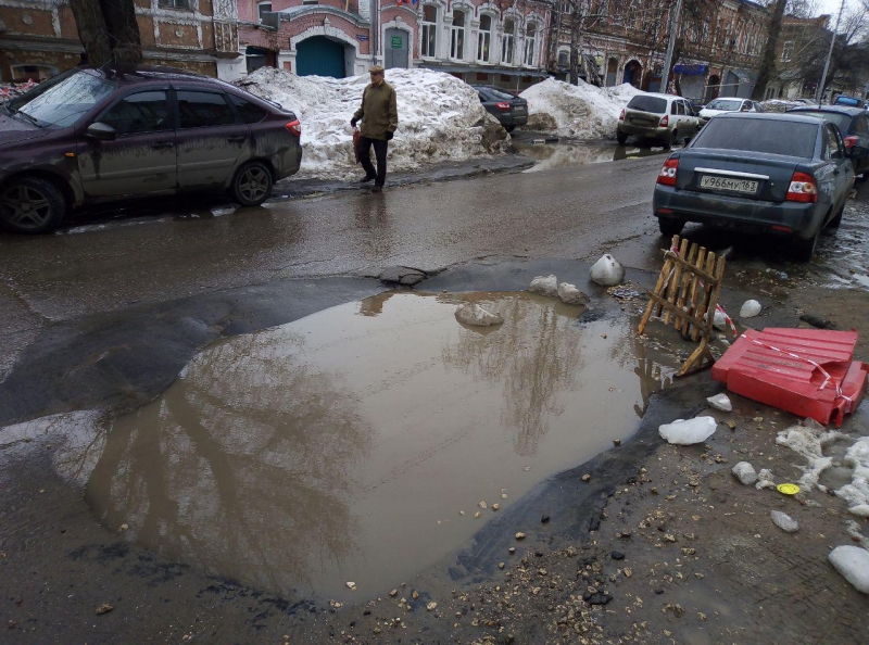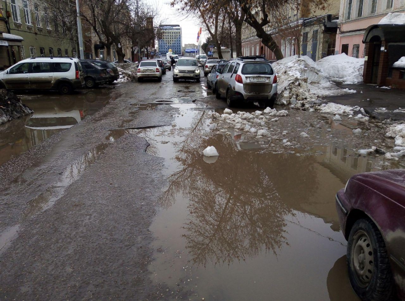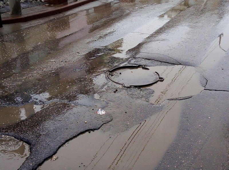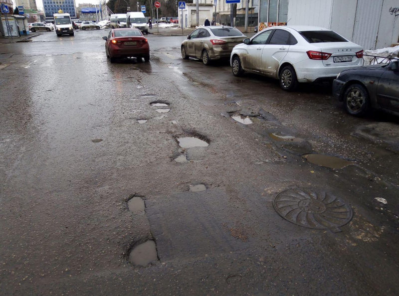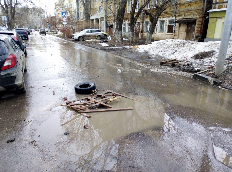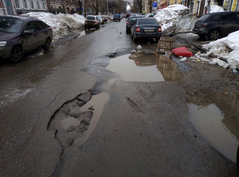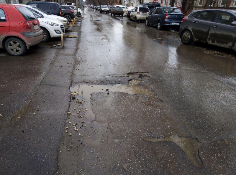 Участок от улицы Вольской до Горького изобилует просадками, выбоинами, отклонившимися от уровня проезжей части люками, а то и вовсе забытыми раскопами. На заставленной машинами дороге объехать этот калейдоскоп препятствий не так и просто, к тому же многие из них скрыты талыми водами. Некоторые лужи заняли всю ширину проезжей части, и каждый раз водители, проезжая по ним, гадают, угодят ли они просто в яму или их поджидает провал, из которого самостоятельно уже не выбраться.