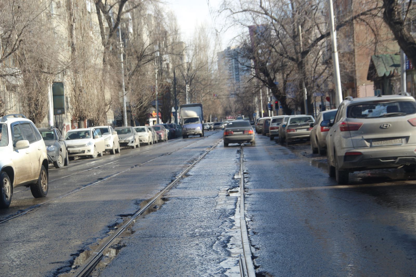 На Горького начала просматриваться колея на участке от Рабочей до Мичурина, на Радищева образовалась неглубокая продольная выбоина на участке от Мичурина до Рабочей.