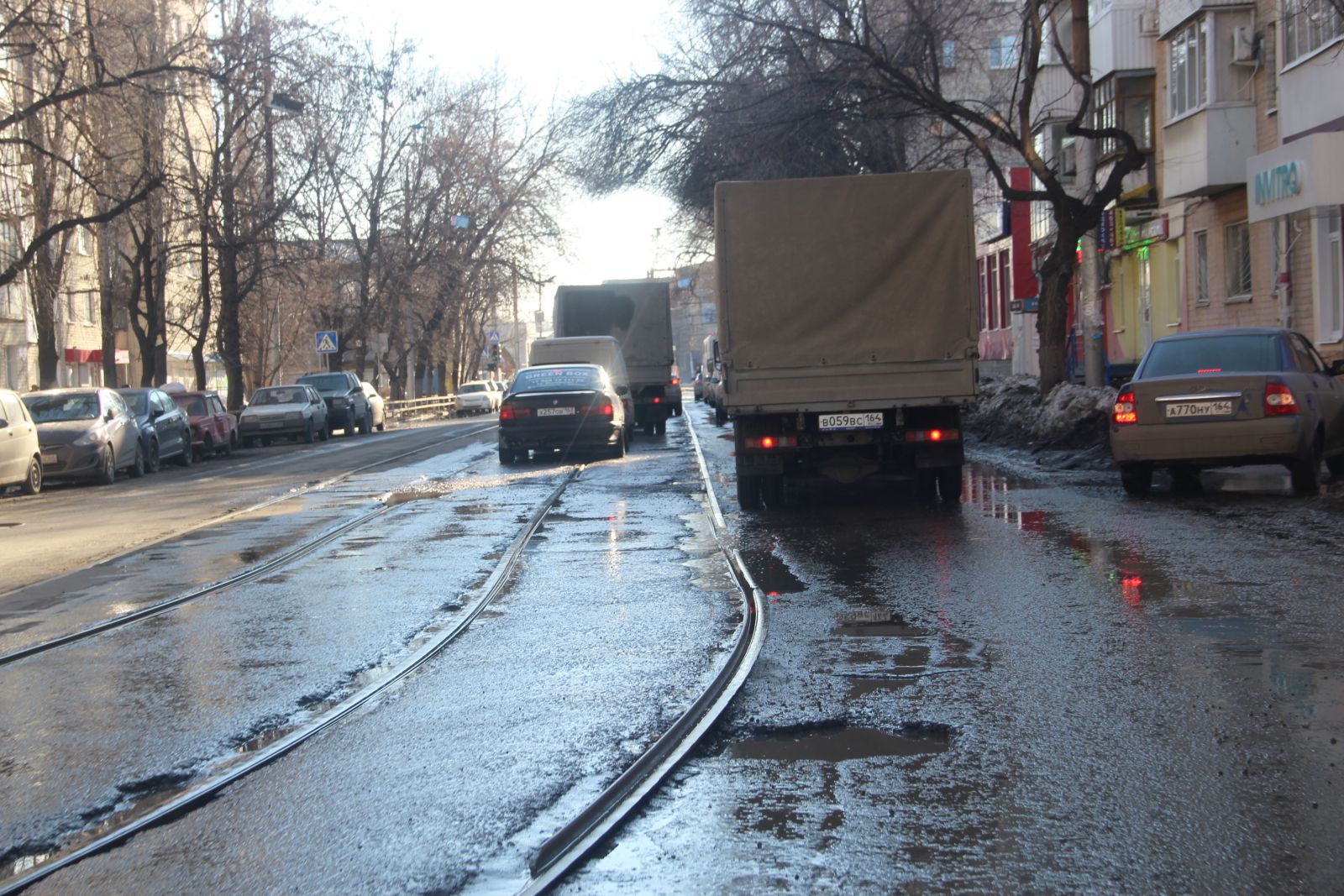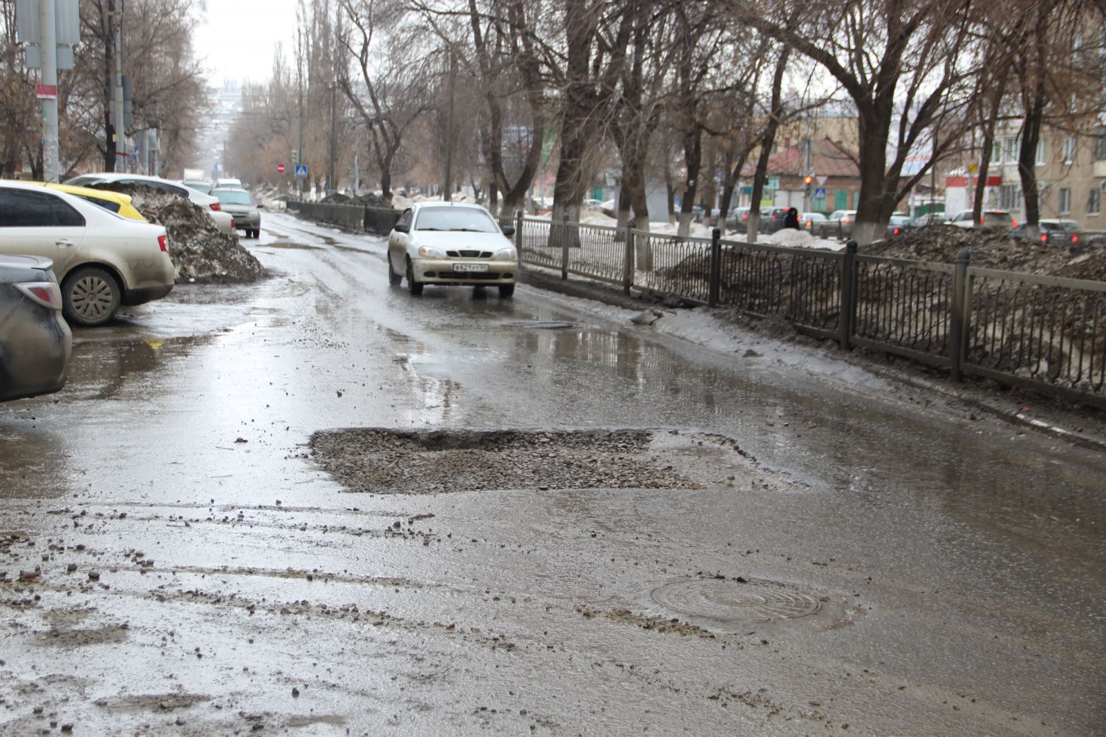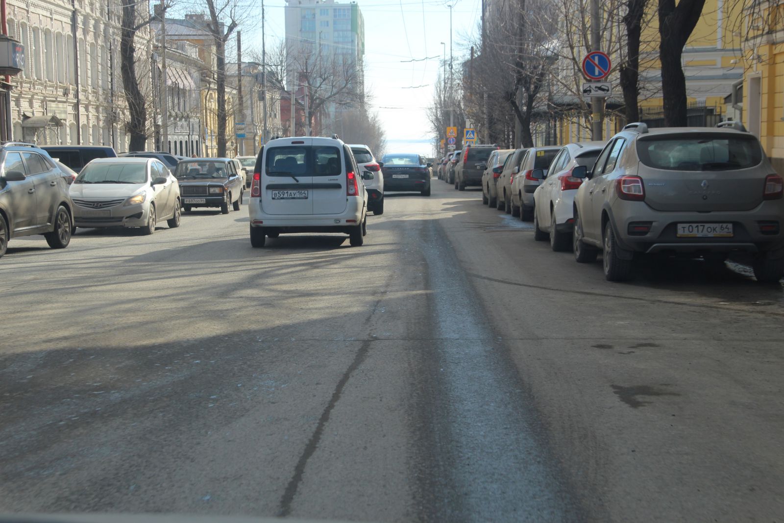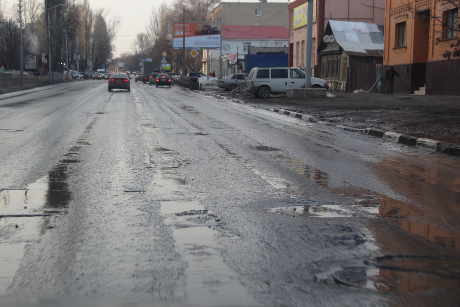 Сложно догадаться, что относительно недавно фирмой «Автогрейд» проводился ремонт автомобильной дороги на улице Чернышевского. Она вся изобилует глубокими просадками, просевшими люками и выглядит, как лоскутное одеяло. Ездить по этой дороге сейчас так же опасно, как и перед ремонтом. Особенно сильно досталось участку от Радищева до Московской. Виной такому состоянию дороги являются бесконечные аварийные вскрышные работы. Коммунальщики при восстановлении дороги не сильно заморачиваются вопросами уплотнения грунта, из-за чего и появляются дорожные дефекты в виде просадок. Новый муниципальный механизм по принуждению через штрафы к качественному восстановлению дорог заработает только в текущем году, поэтому нет ничего удивительного в плачевном состоянии одной из главных улиц города. Ко всему прочему, на участке от Первомайской до Московской продолжил разрушение шов сопряжения полос и начали проглядывать небольшие выбоины, которые можно заметить и на участке между Вольской и Провиантской.