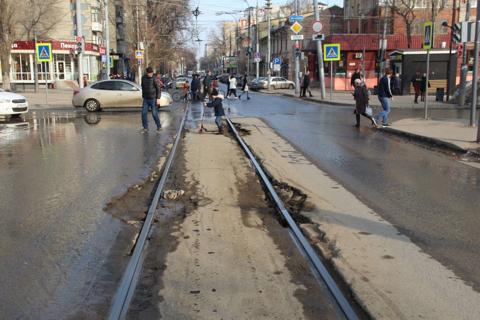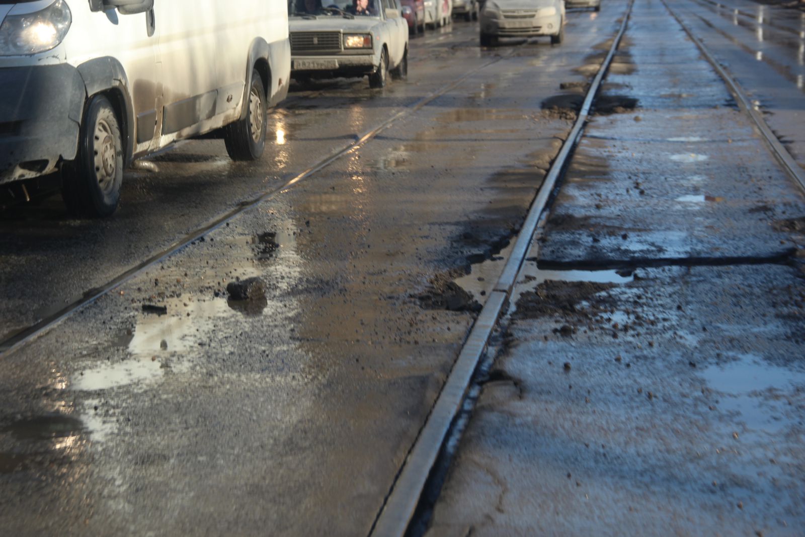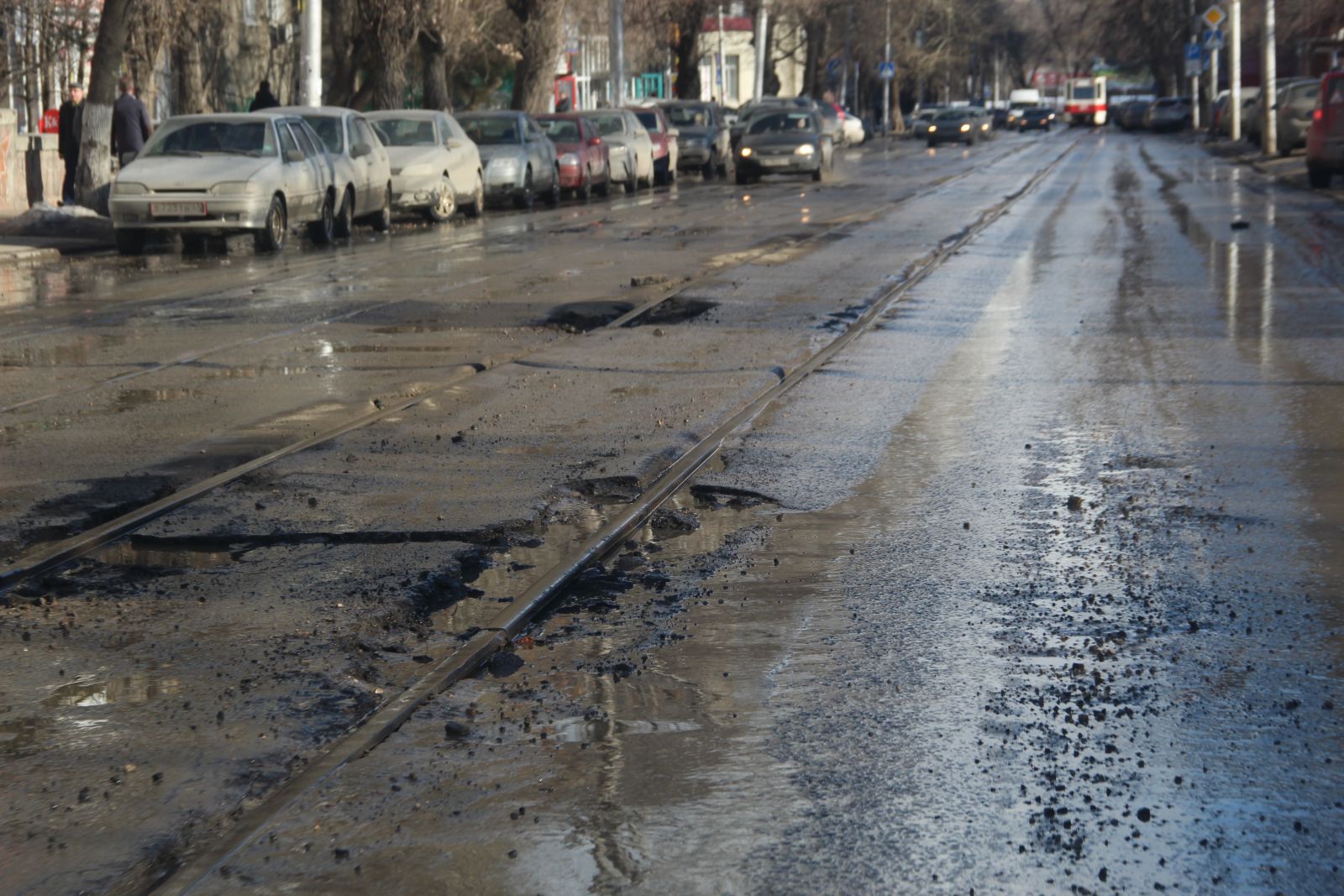 На улицах Советской от Чапаева до Астраханской (ООО «Оптима») и Слонова от Астраханской до Разина (АО «Автогрейд») асфальт ожидаемо разрушился вдоль трамвайных путей. О том, что это произойдет из-за вибраций, создаваемых трамваями на старых путях, знали все. Однако заказчик в лице городской администрации почему-то решил «одеть» рельсы в асфальт, и теперь устранять выбоины вдоль рельсов приходится на протяжении всего гарантийного срока. При этом не относящиеся к рельсам участки дороги в целом справляются с нагрузкой.