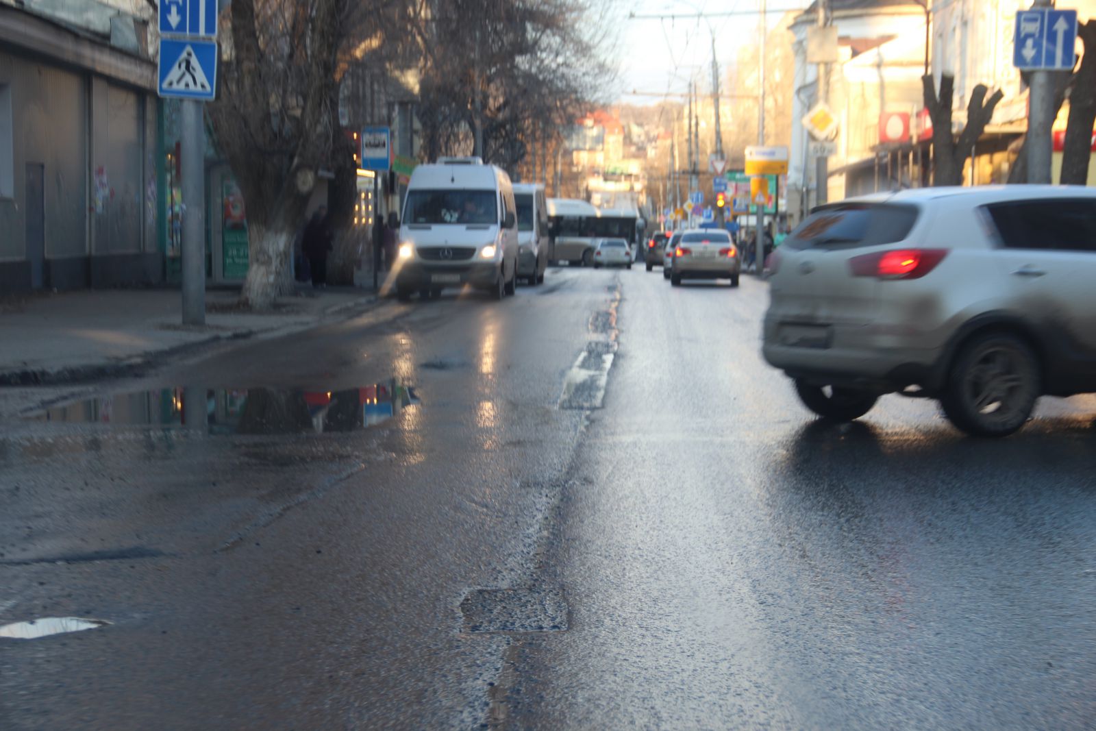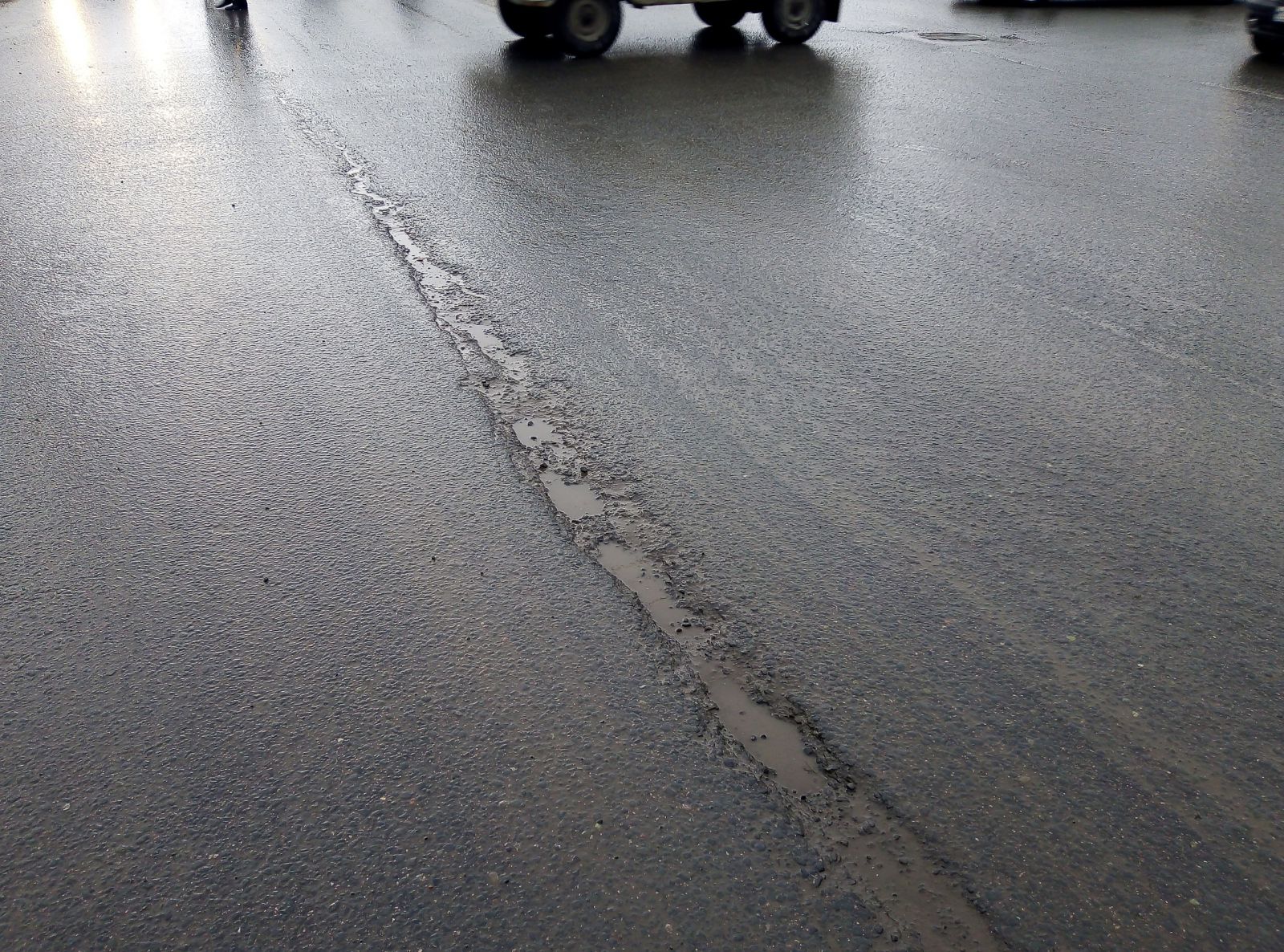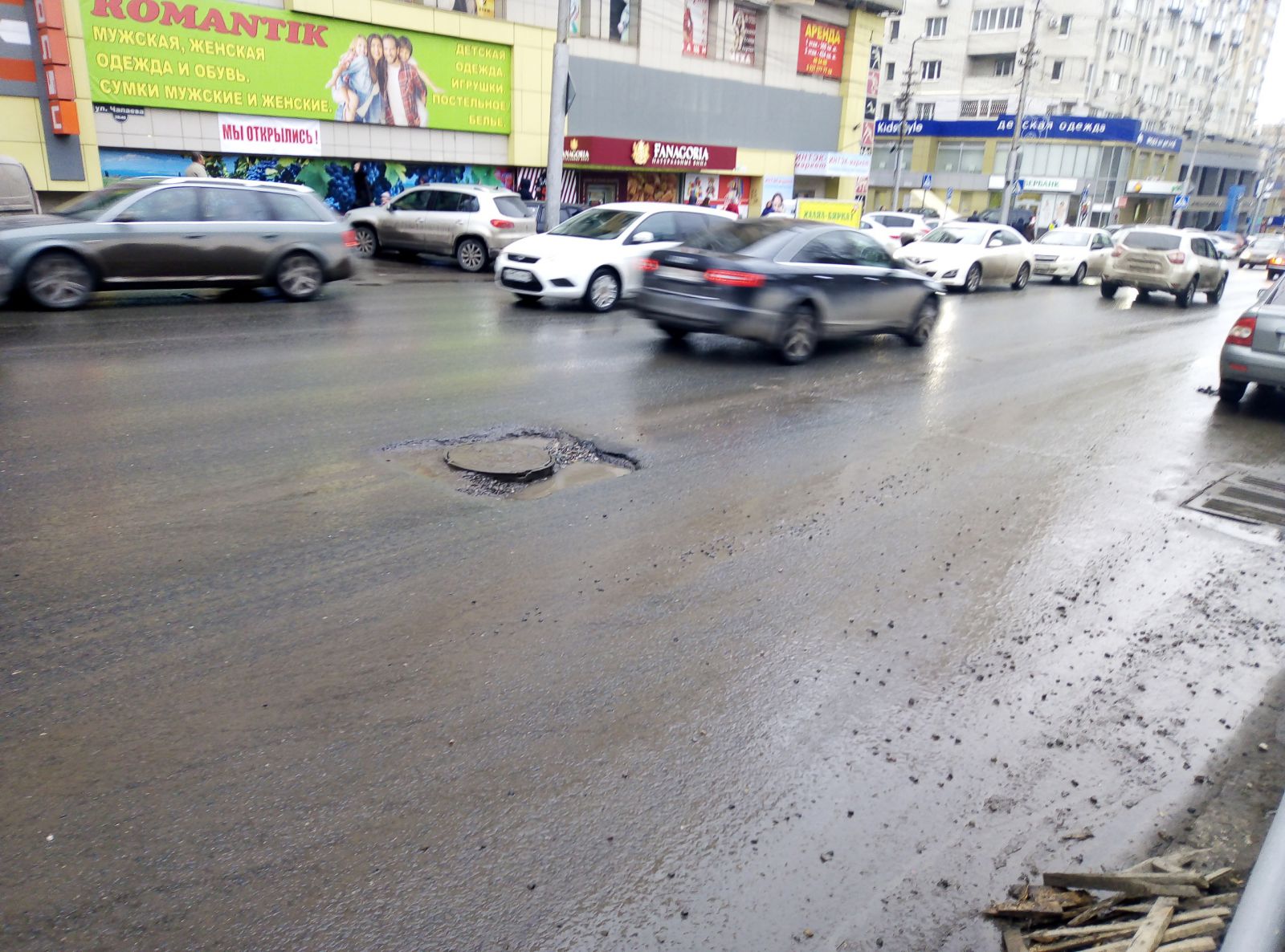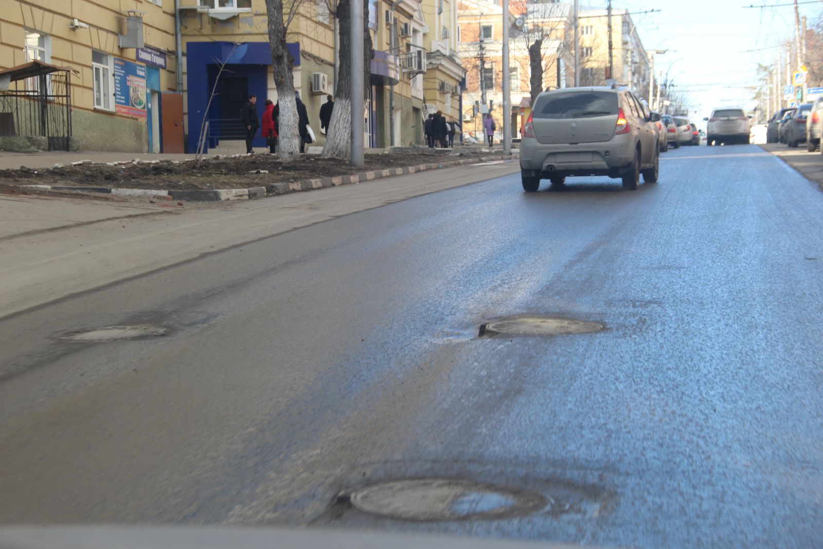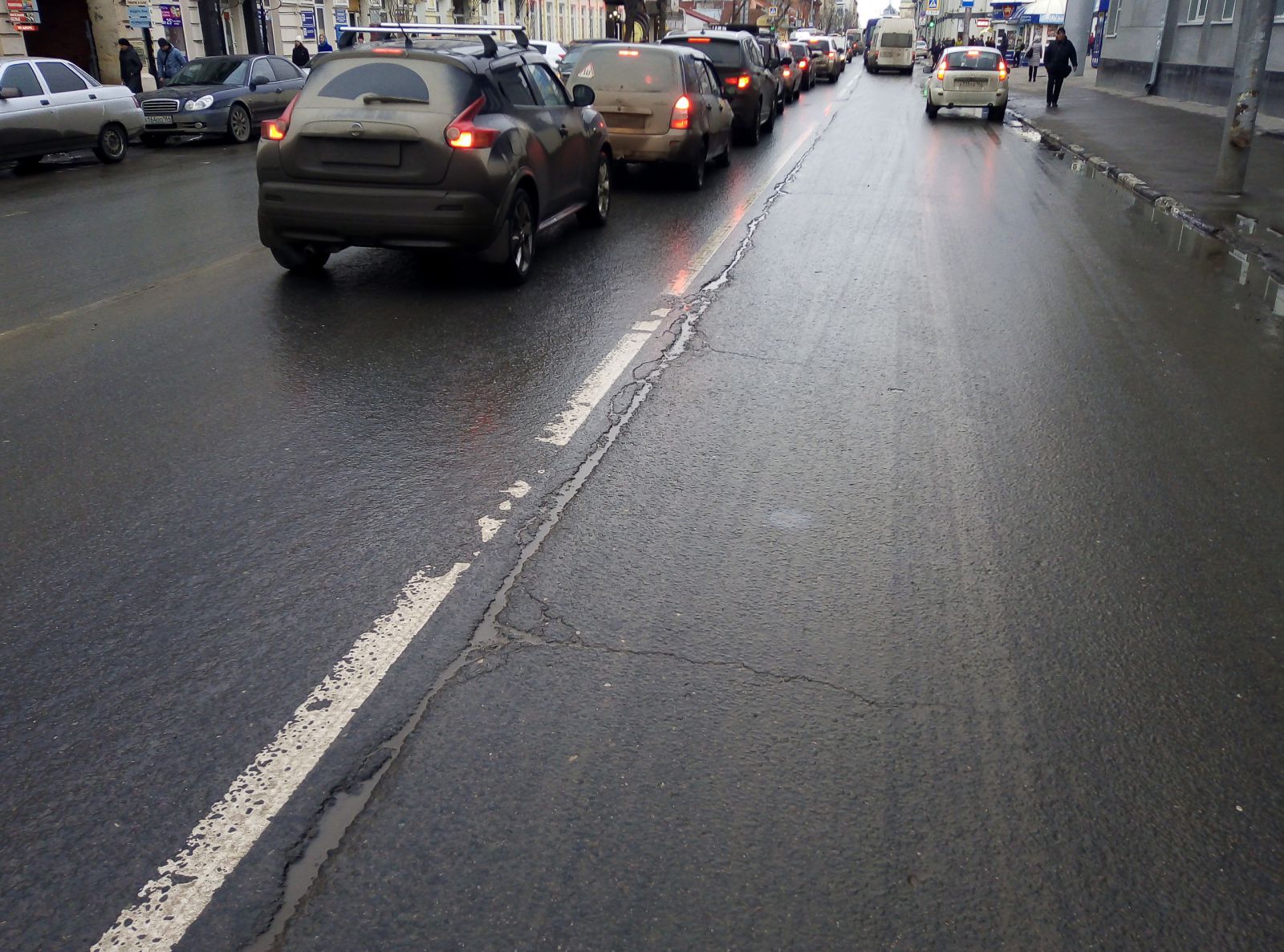 Кое-где выбоины начали просматриваться на улице Чапаева, где участок от Московской до площади Ильинской ремонтировало ООО «Автодорожник». Они носят штучный характер, в отличие разрушающихся швов сопряжения, начиная от улицы Киселева.