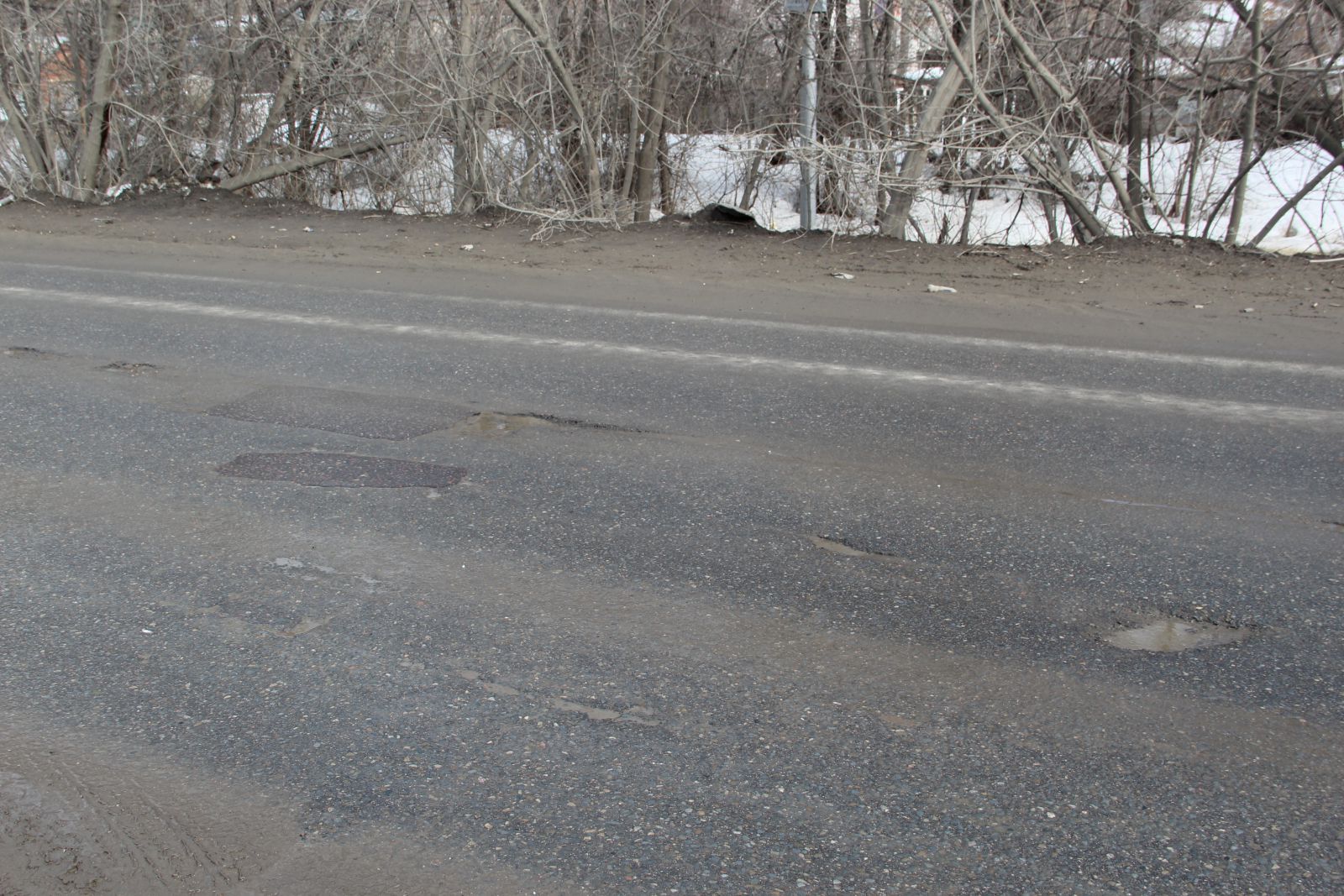 Ближе к концу гарантийного срока она вся покрылась выбоинами, которые ямочным методом устраняет подрядчик «Эко-Строй». Латки, выбоины и разрушающийся шов сопряжения полос можно обнаружить на всем протяжении отремонтированной дороги.
