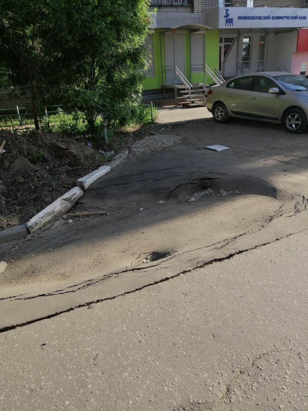 У дома 7а по Усть-Курдюмской латка на месте восстановленного после вскрышных работ покрытия значительно просела и местами начала обваливаться. За минувшее время разрушения покрытия продолжились.