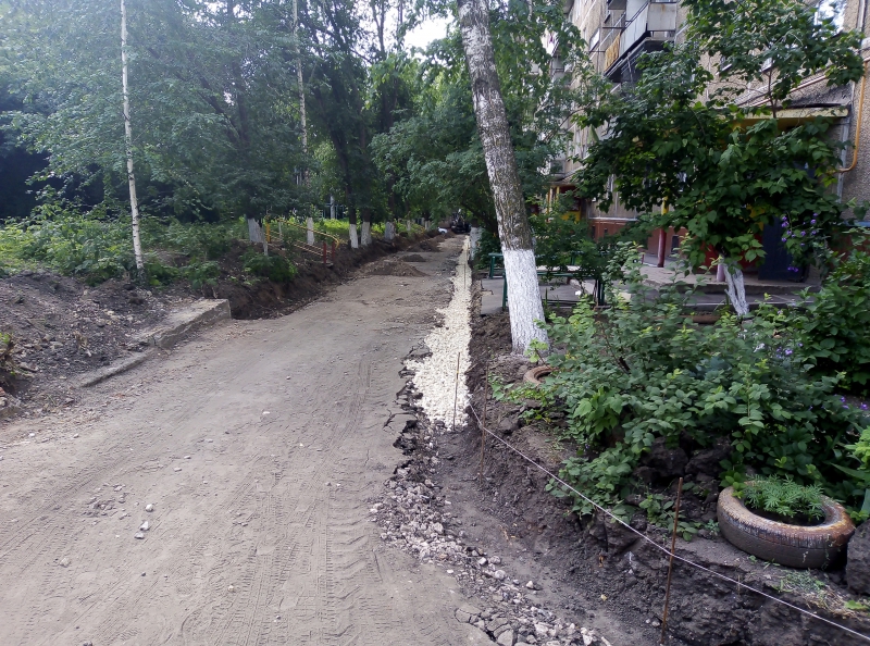 На улице Рябиновской у дома №4 подрядчик произвел демонтаж старого бордюра, оборудовал земляные ящики под новый, отсыпал их щебнем. При этом демонтаж асфальта на проезде вдоль дома произведен не был, хотя и предусмотрен контрактом. Такую странную последовательность действий представитель подрядной организации объяснил собственной технологией и заверил, что все предусмотренные контрактом работы, в том числе демонтаж старого покрытия, будут выполнены.