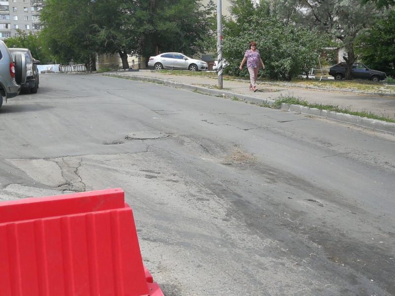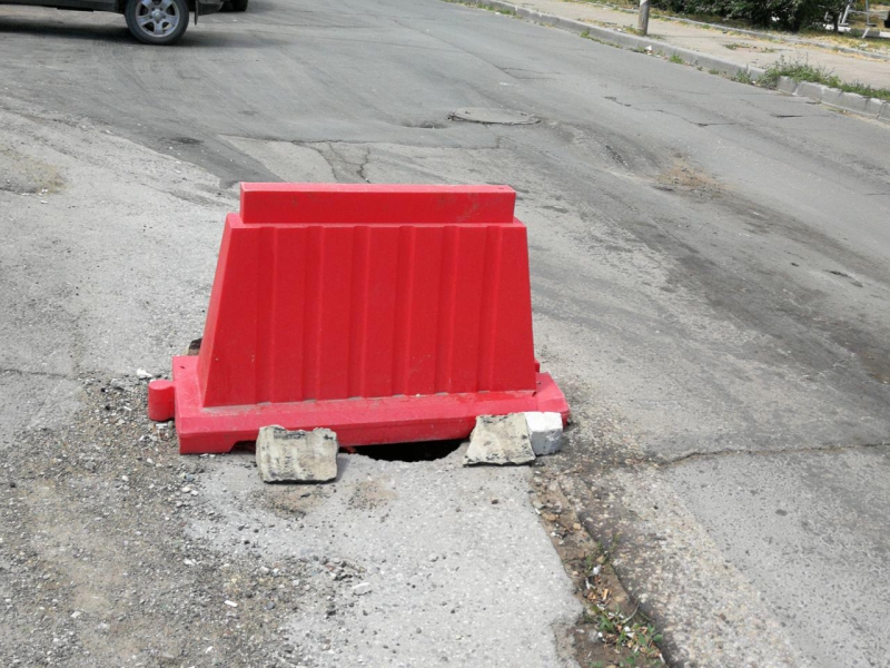 Справа от просадки находится открытый люк, обозначенных водоналивными блоком. В результате для движения свободной остается лишь одна полоса. Дальнейшее увеличение просадки рискует перекрыть и ее, сделав невозможным движение по этому участку транспортной сети города.