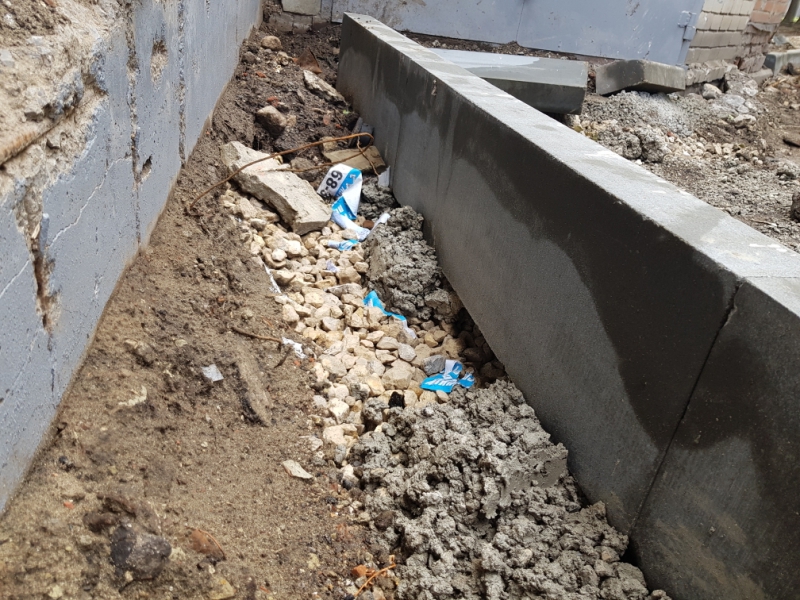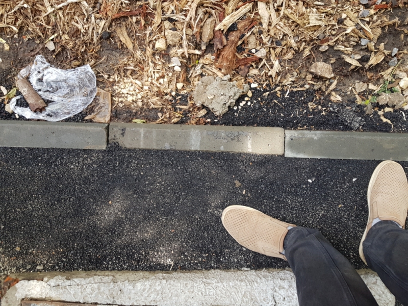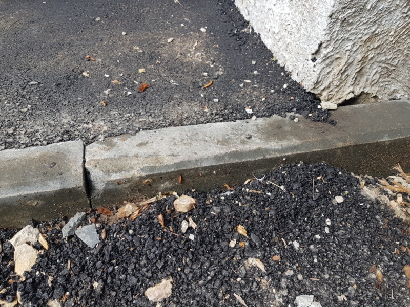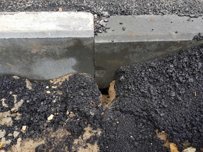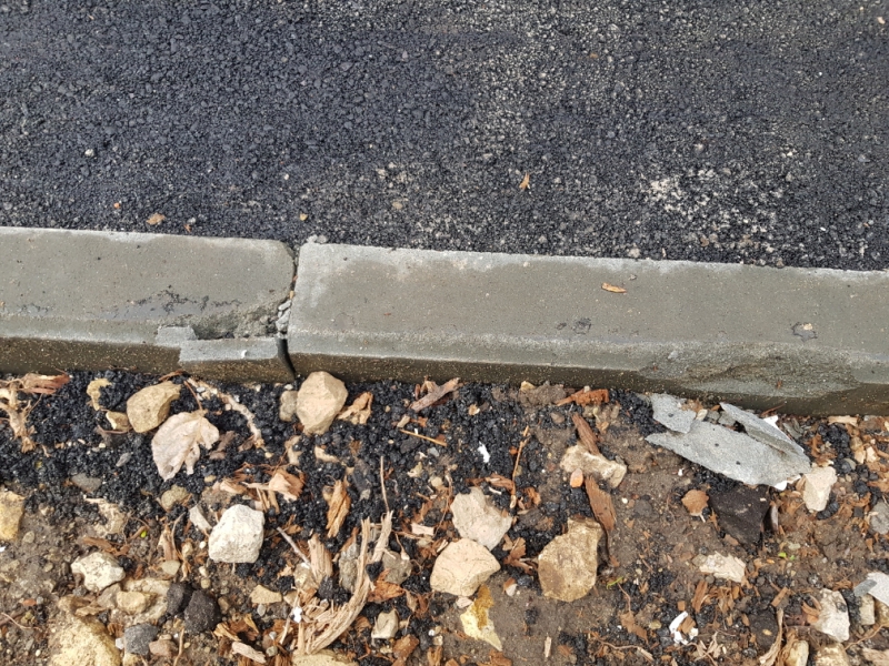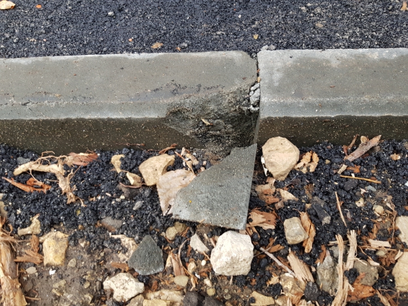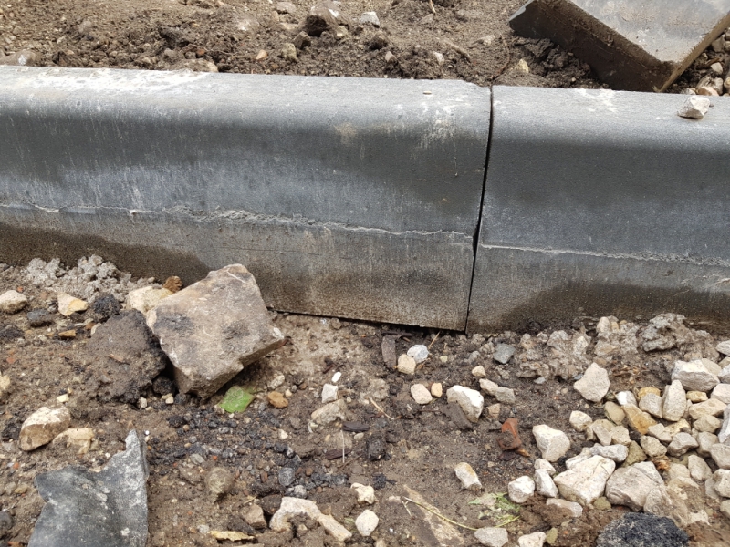 Вопросы контролирующих органов могут возникнуть к количеству бетона, который использовался для установки бортового камня. Ставя бордюр на бетонные маяки (вместо того, чтобы сразу ставить в замок), подрядчик не озаботился последующим добавлением раствора под бордюр, из-за чего под ним в некоторых местах зияют пустоты. На бортовом камне заметны многочисленные сколы.