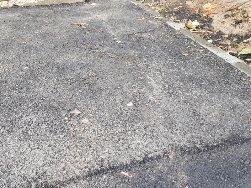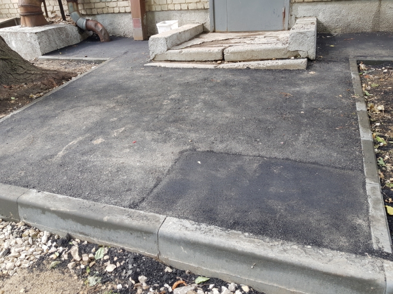 Качество укладки асфальта также оставляет желать лучшего. Подрядчик пока успел только заасфальтировать входные группы. Уже сейчас покрытие на них вышелушивается, наблюдаются места сегрегации. Попытки залатать проблемные участки, не спасают ситуацию. Глядя на то, как проходит ремонт двора сейчас, можно смело говорить о том, что подрядчику предстоит переделать многое.
