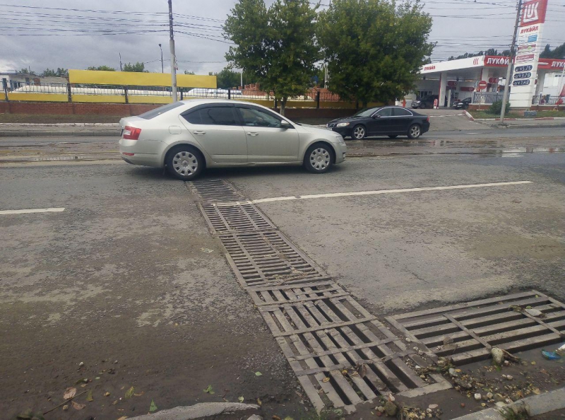 Дождеприемник на улице Танкистов, рядом с заправкой «Лукойл», находится ниже уровня дорожного покрытия с момента ремонта дороги в прошлом году.